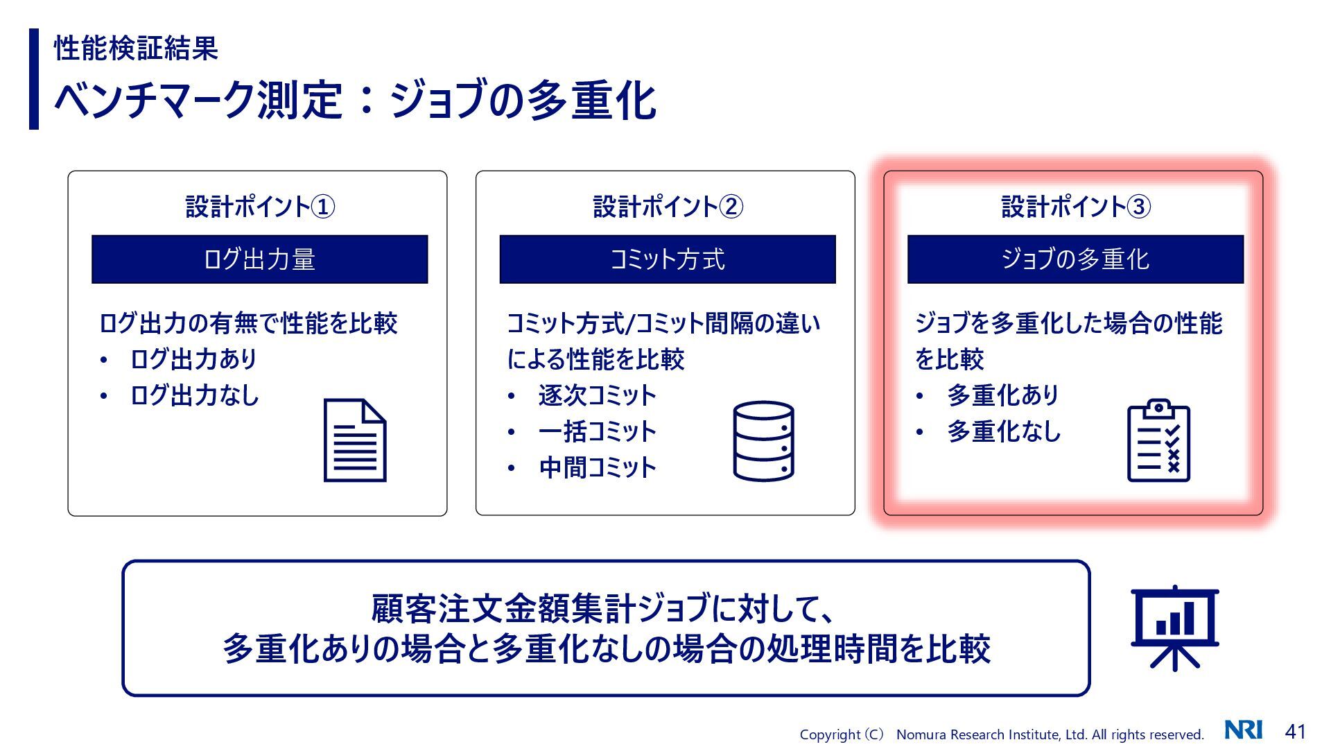 ベンチマーク測定:ジョブの多重化 性能検証結果 顧客注文金額集計ジョブに対して、 多重化ありの場合と多重化なしの場合の処理時間を比較 ログ出力量 ログ出力の有無で性能を比較 • ログ出力あり • ログ出力なし 設計ポイント① コミット方式 コミット方式/コミット間隔の違い による性能を比較 • 逐次コミット • 一括コミット • 中間コミット 設計ポイント② ジョブの多重化 ジョブを多重化した場合の性能 を比較 • 多重化あり • 多重化なし 設計ポイント③