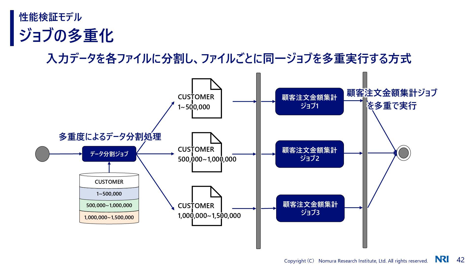ジョブの多重化 性能検証モデル 入力データを各ファイルに分割し、ファイルごとに同一ジョブを多重実行する方式 1,000,000~1,500,000 500,000~1,000,000 1~500,000 データ分割ジョブ CUSTOMER 顧客注文金額集計 ジョブ1 顧客注文金額集計 ジョブ2 顧客注文金額集計 ジョブ3 CUSTOMER 1~500,000 CUSTOMER 500,000~1,000,000 CUSTOMER 1,000,000~1,500,000 多重度によるデータ分割処理 顧客注文金額集計ジョブ を多重で実行
