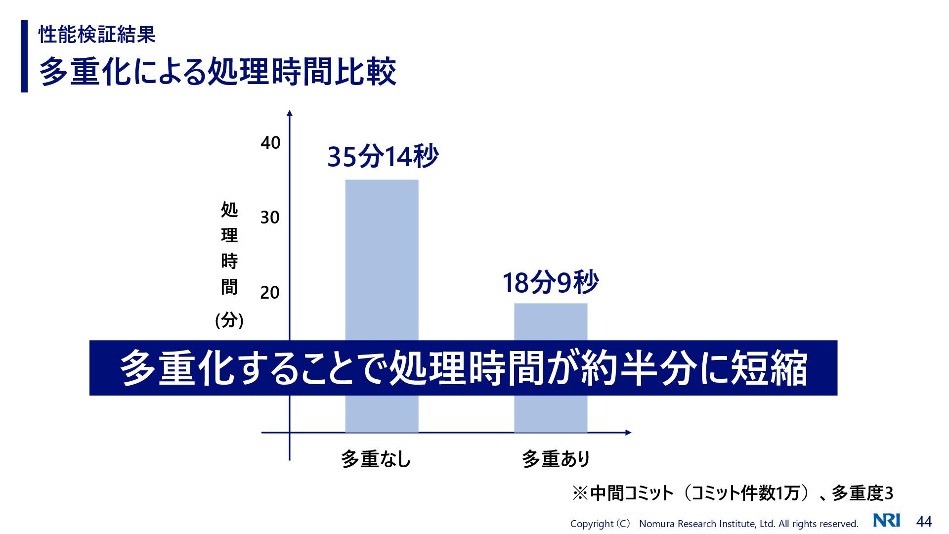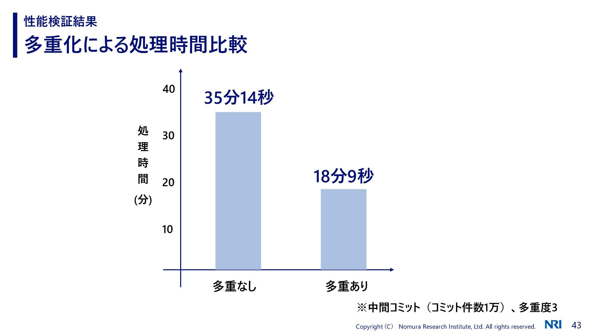 多重化による処理時間比較 性能検証結果 10 20 30 40 処 理 時 間 (分) 多重なし 多重あり 35分14秒 18分9秒 ※中間コミット(コミット件数1万)、多重度3