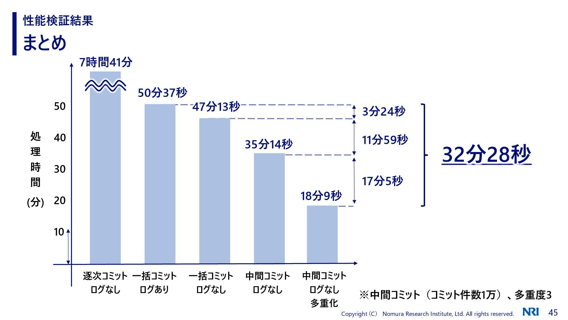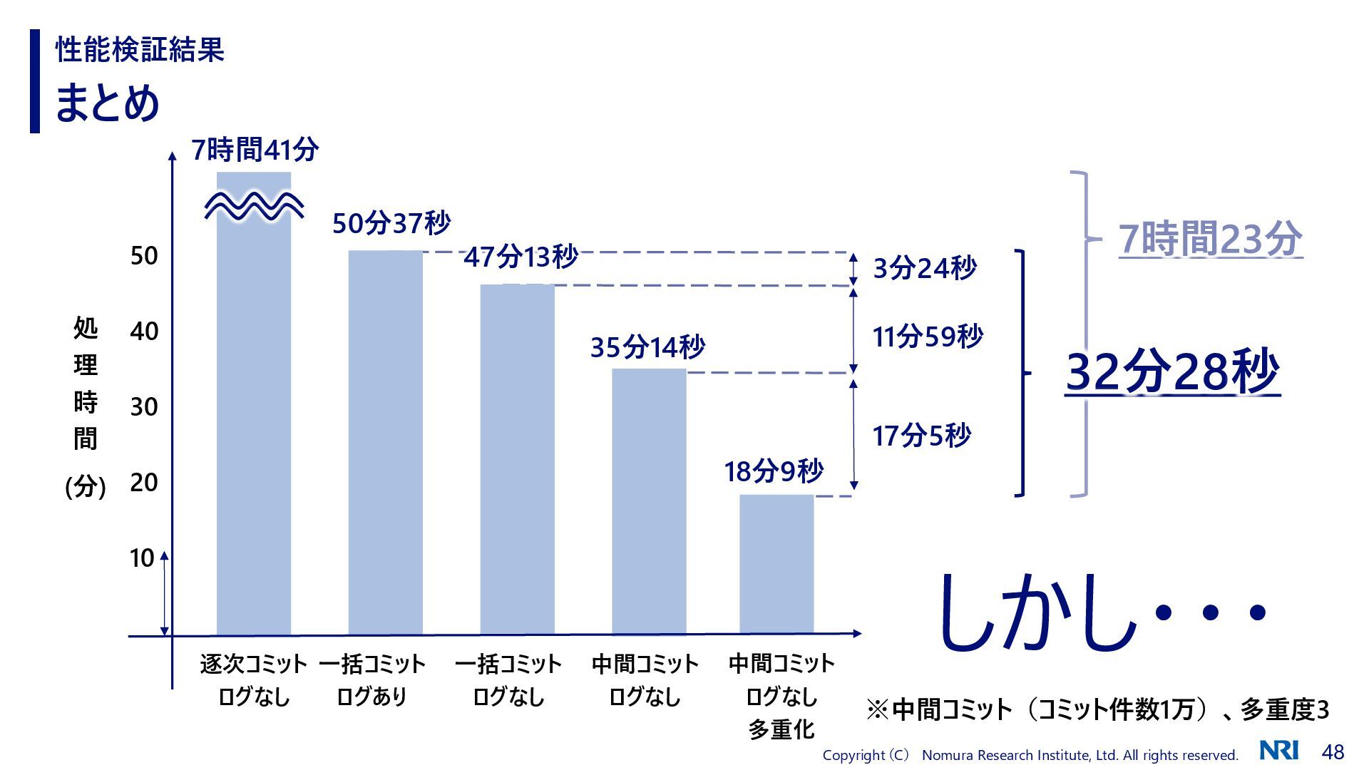 47分13秒 まとめ 性能検証結果 10 20 30 40 50 処 理 時 間 (分) 逐次コミット ログなし 一括コミット ログあり 7時間41分 35分14秒 18分9秒 50分37秒 3分24秒 11分59秒 17分5秒 一括コミット ログなし 中間コミット ログなし 中間コミット ログなし 多重化 ※中間コミット(コミット件数1万)、多重度3 32分28秒 しかし・・・