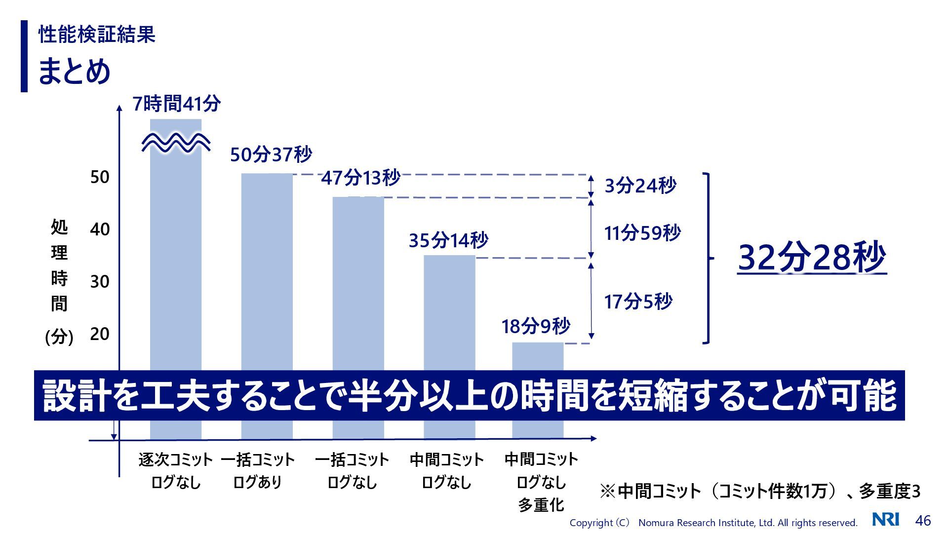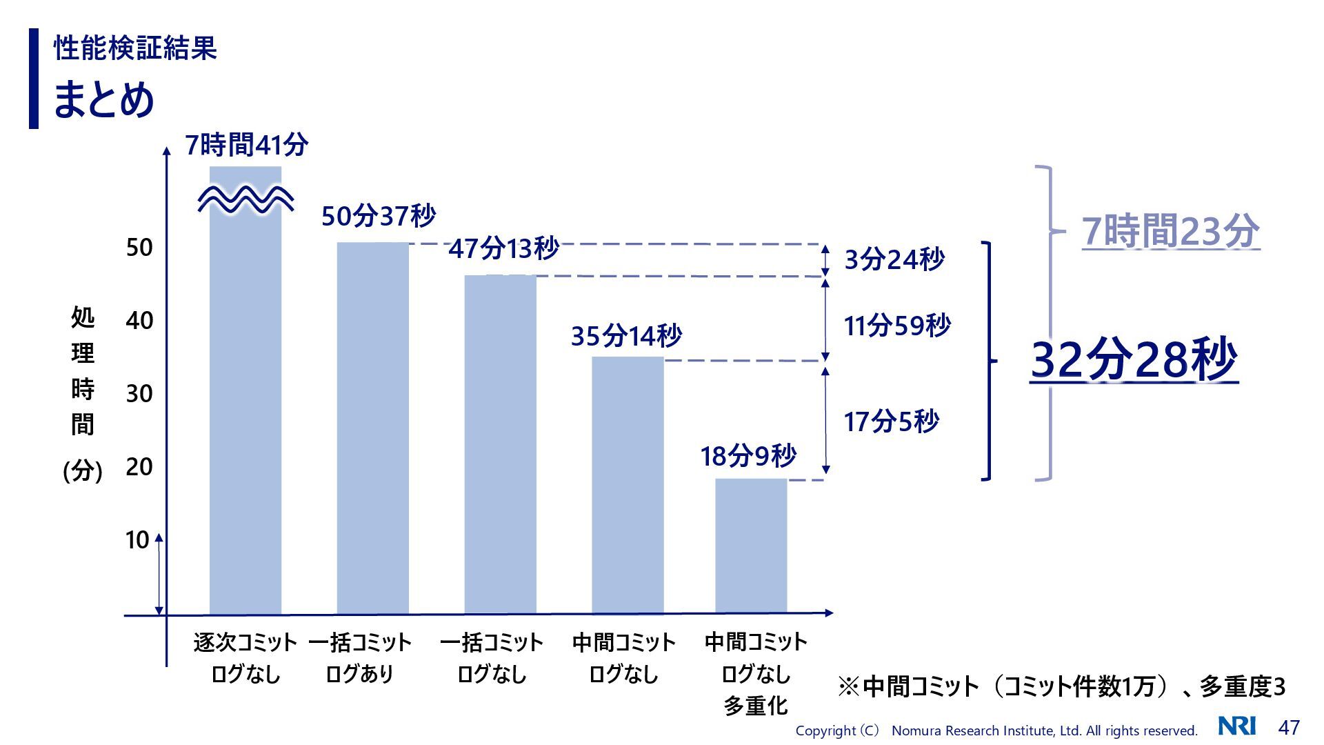 47分13秒 まとめ 性能検証結果 10 20 30 40 50 処 理 時 間 (分) 逐次コミット ログなし 一括コミット ログあり 7時間41分 35分14秒 18分9秒 50分37秒 3分24秒 11分59秒 17分5秒 一括コミット ログなし 中間コミット ログなし 中間コミット ログなし 多重化 32分28秒 ※中間コミット(コミット件数1万)、多重度3 設計を工夫することで半分以上の時間を短縮することが可能