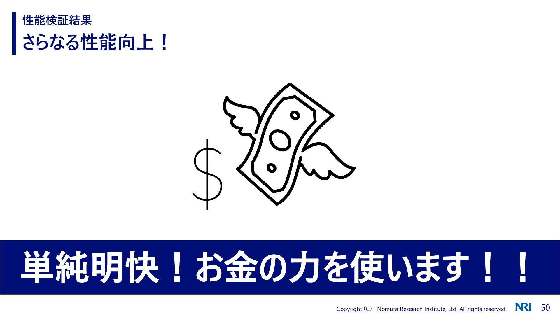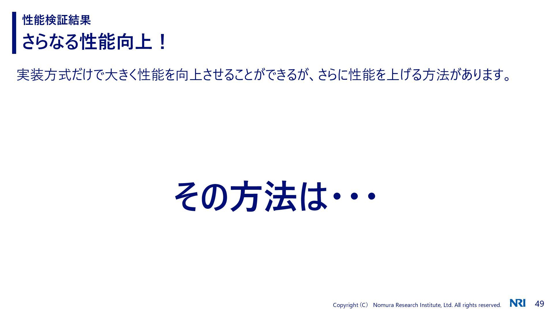 さらなる性能向上! 性能検証結果 実装方式だけで大きく性能を向上させることができるが、さらに性能を上げる方法があります。 その方法は・・・