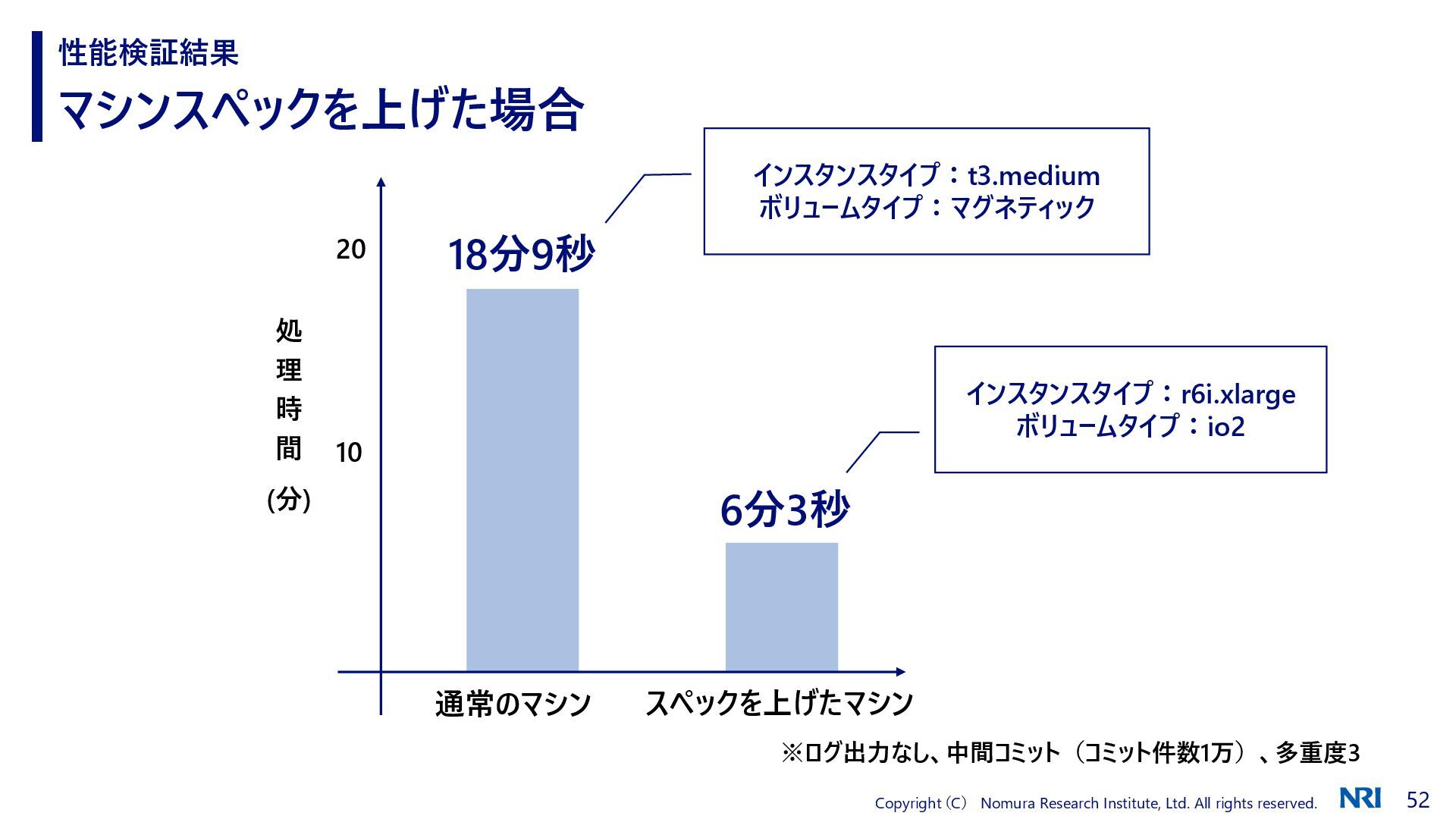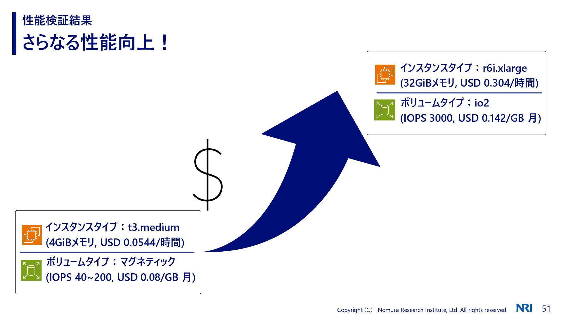 さらなる性能向上! 性能検証結果 インスタンスタイプ:t3.medium (4GiBメモリ, USD 0.0544/時間) ボリュームタイプ:マグネティック (IOPS 40~200, USD 0.08/GB 月) インスタンスタイプ:r6i.xlarge (32GiBメモリ, USD 0.304/時間) ボリュームタイプ:io2 (IOPS 3000, USD 0.142/GB 月)