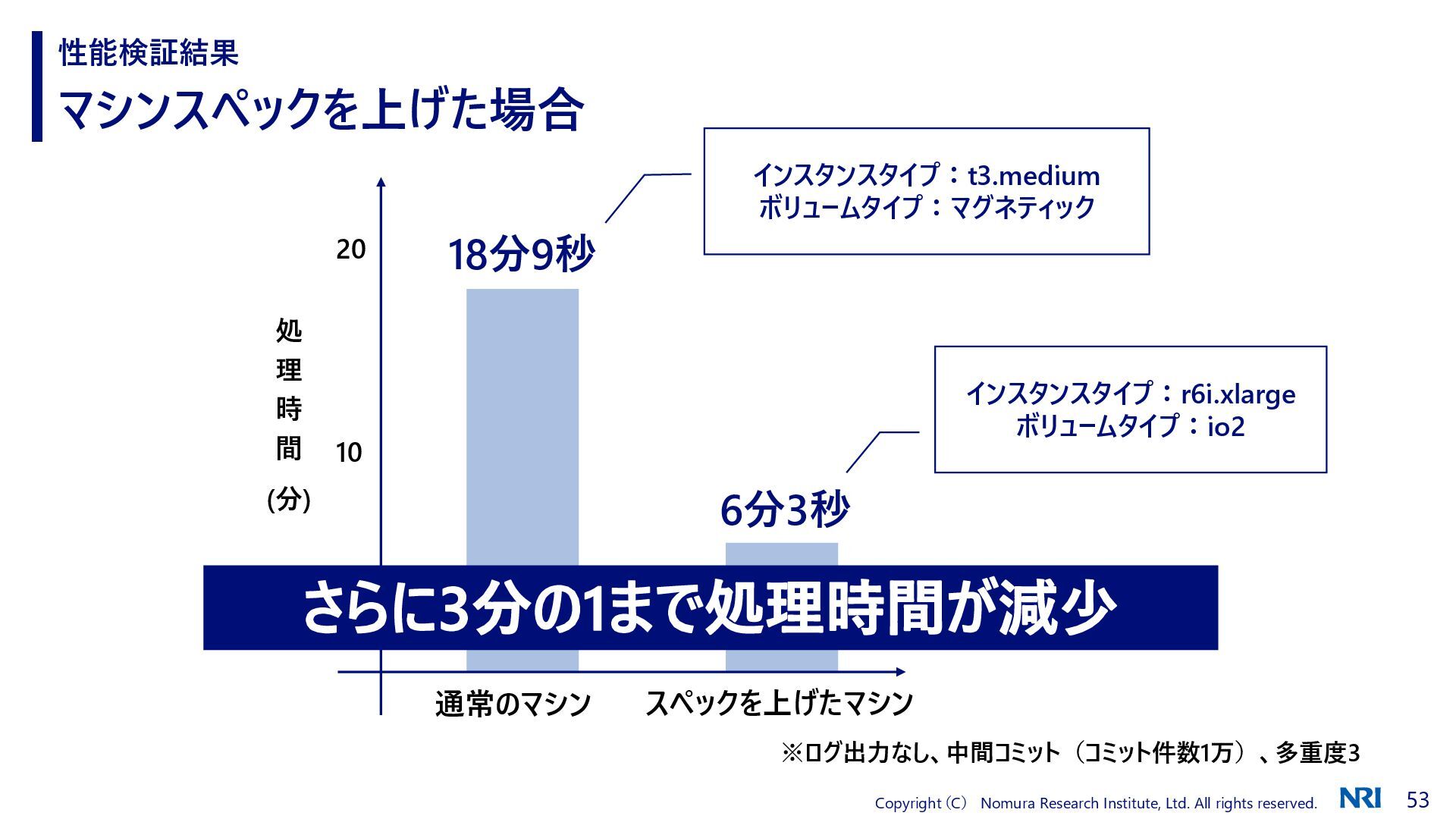 マシンスペックを上げた場合 性能検証結果 10 20 処 理 時 間 (分) 通常のマシン スペックを上げたマシン 6分3秒 18分9秒 ※ログ出力なし、中間コミット(コミット件数1万)、多重度3 インスタンスタイプ:r6i.xlarge ボリュームタイプ:io2 インスタンスタイプ:t3.medium ボリュームタイプ:マグネティック