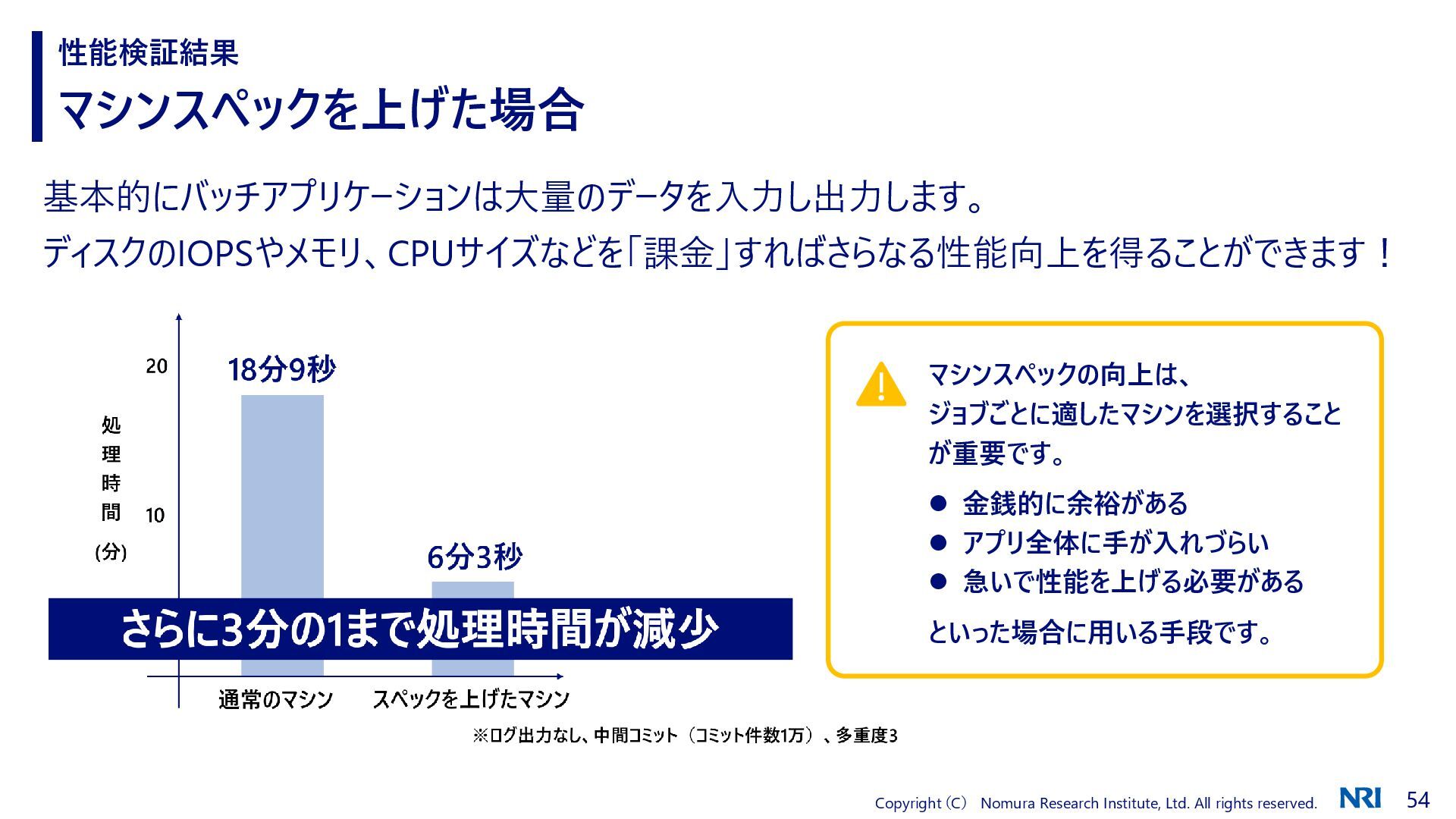 マシンスペックを上げた場合 性能検証結果 基本的にバッチアプリケーションは大量のデータを入力し出力します。 ディスクのIOPSやメモリ、CPUサイズなどを「課金」すればさらなる性能向上を得ることができます! マシンスペックの向上は、 ジョブごとに適したマシンを選択すること が重要です。 ⚫ 金銭的に余裕がある ⚫ アプリ全体に手が入れづらい ⚫ 急いで性能を上げる必要がある といった場合に用いる手段です。