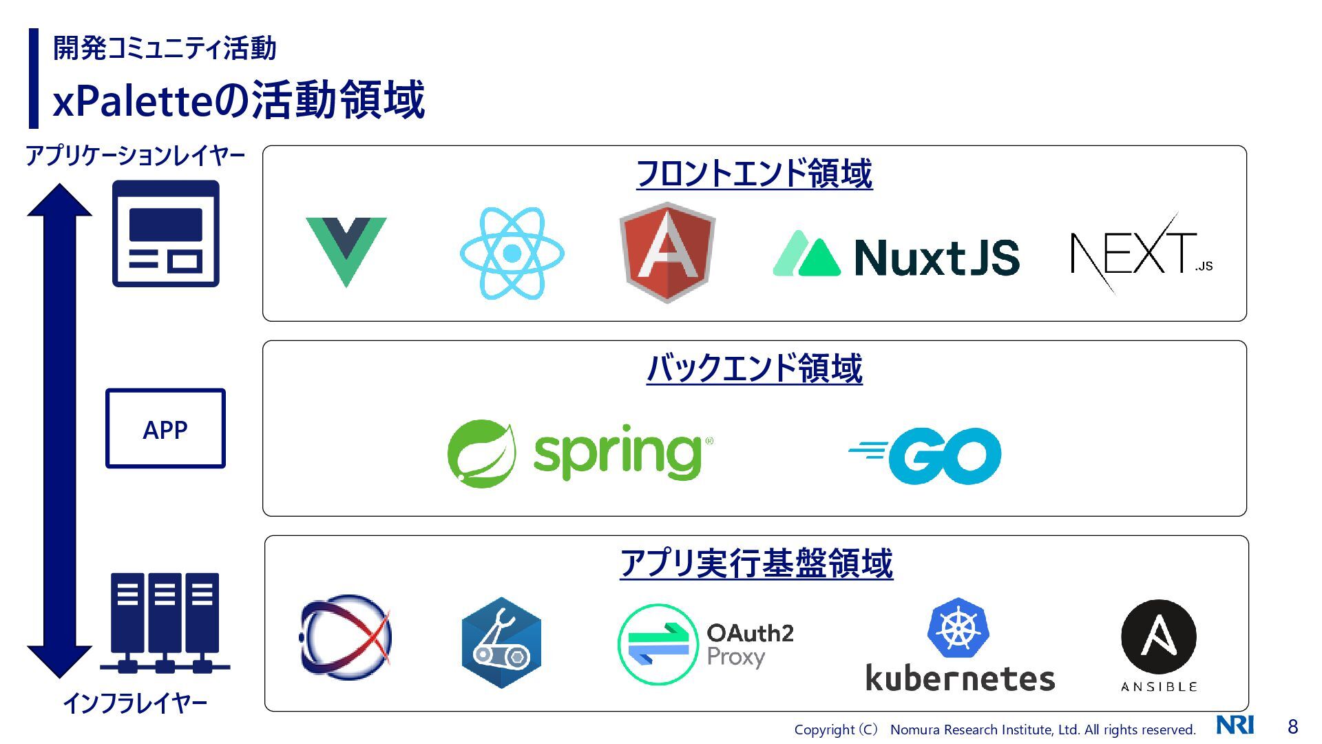 xPaletteの活動領域 開発コミュニティ活動 バックエンド領域 アプリ実行基盤領域 フロントエンド領域 アプリケーションレイヤー インフラレイヤー APP