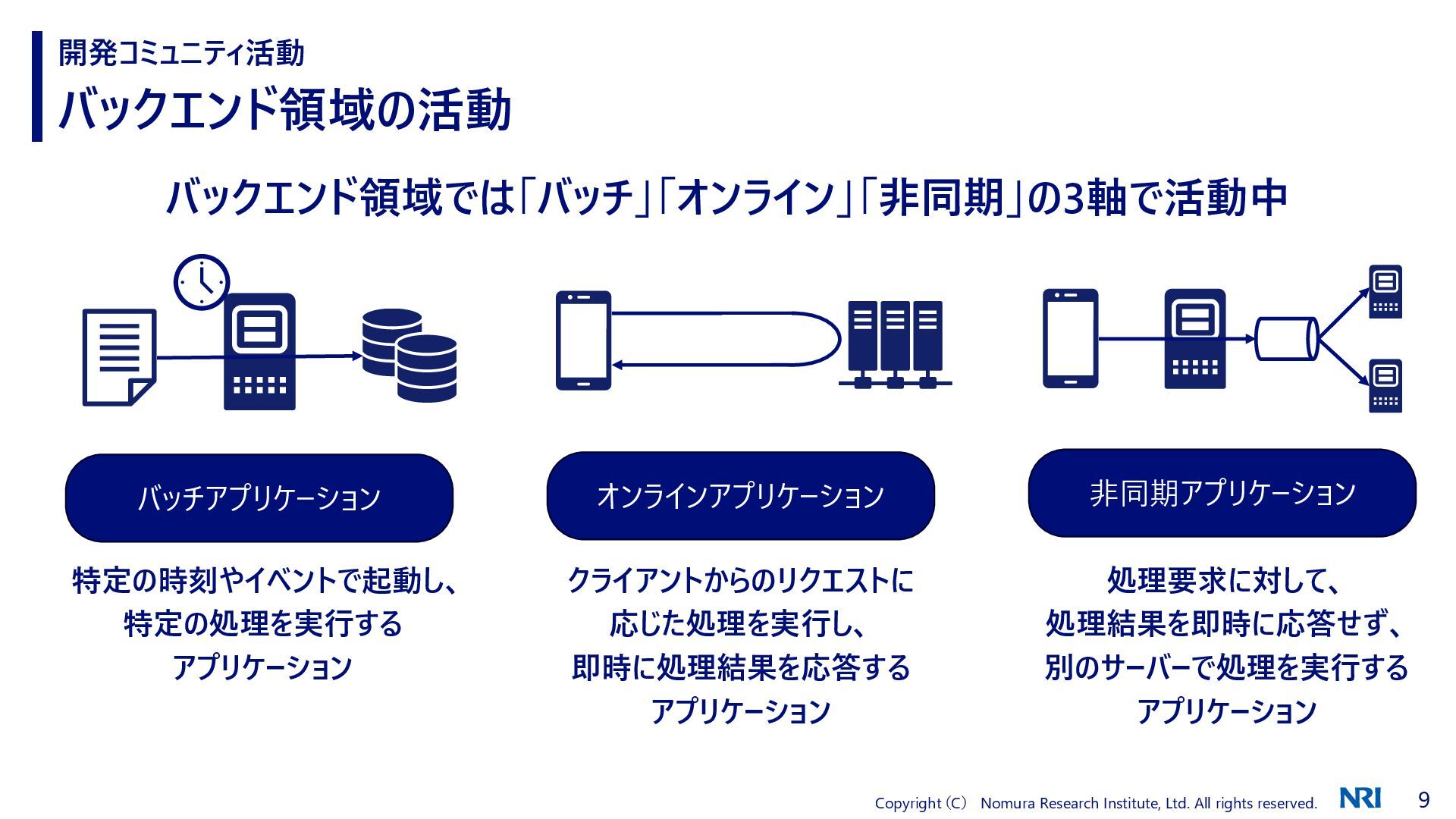 バックエンド領域の活動 開発コミュニティ活動 バッチアプリケーション オンラインアプリケーション 非同期アプリケーション バックエンド領域では「バッチ」「オンライン」「非同期」の3軸で活動中 特定の時刻やイベントで起動し、 特定の処理を実行する アプリケーション クライアントからのリクエストに 応じた処理を実行し、 即時に処理結果を応答する アプリケーション 処理要求に対して、 処理結果を即時に応答せず、 別のサーバーで処理を実行する アプリケーション