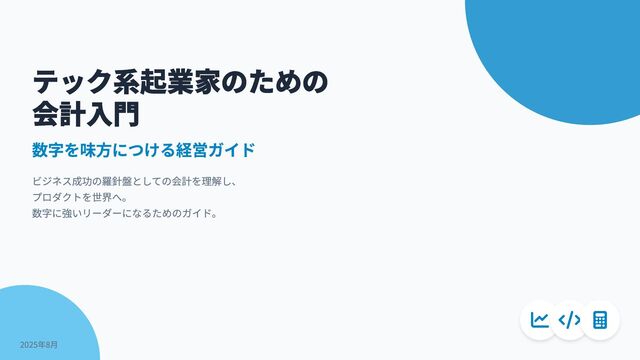 資本」 純資産(Equity):返済不要の出資金や利益の蓄積。「自己資本」 B/Sを読むことで、「返済不要の自己資本が厚い安定した会社か」 「借入 金が多くてリスクが高いか」など、会社の財務的な体力を一目で把握で きます。 資産 1億円 負債+純資産 1億円 資産 = 負債 + 純資産 現金・預金:3,000万円 売掛金:2,000万円 設備・ソフトウェア: 5,000万円 借入金:4,000万円 買掛金:1,000万円 純資産:5,000万円 テック系起業家のための会計入門