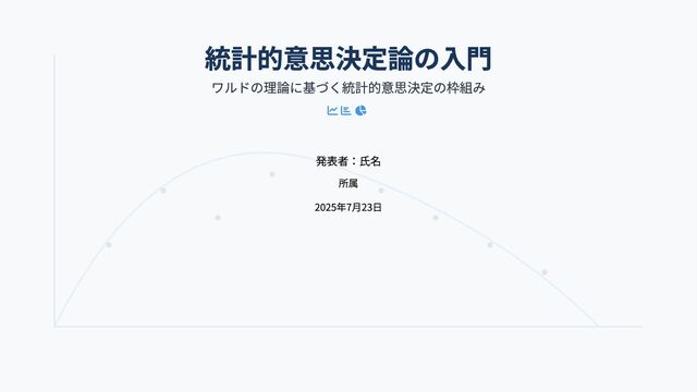 二乗誤差損失: L(θ, d) = (θ - d)² 絶対誤差損失: L(θ, d) = |θ - d| 0-1損失: L(θ, d) = 1_{θ≠d} リスク関数の定義 パラメータθ の下で決定関数δ を適用したときの平均損失 R(θ, δ) = E_θ[L(θ, δ(X))] リスク関数と期待損失 リスク関数は決定関数δ による「平均的な損失の大きさ」を表し、性能評価指標として 機能します 二乗誤差損失の例: R(θ, δ) = E_θ[(θ - δ(X))²] これは推定の分野で言う平均二乗誤差(MSE)に他なりません 損失関数の選び方 問題の性質に応じて設定 対称性や単調性を考慮 数学的扱いやすさも重要 意思決定のプロセス 1. 損失関数を定義 2. リスク関数を計算 3. リスク最小の決定関数を選択 最適な意思決定 リスク関数による決定則の評価 異なる決定関数δ₁ とδ₂ のリスクを比較することで優劣を判定できます R(θ, δ₁) 決定関数1のリスク vs R(θ, δ₂) 決定関数2のリスク すべてのθ に対してR(θ, δ₁) ≤ R(θ, δ₂) なら、 δ₁ はδ₂ を支配する(より良い決定関数である)
