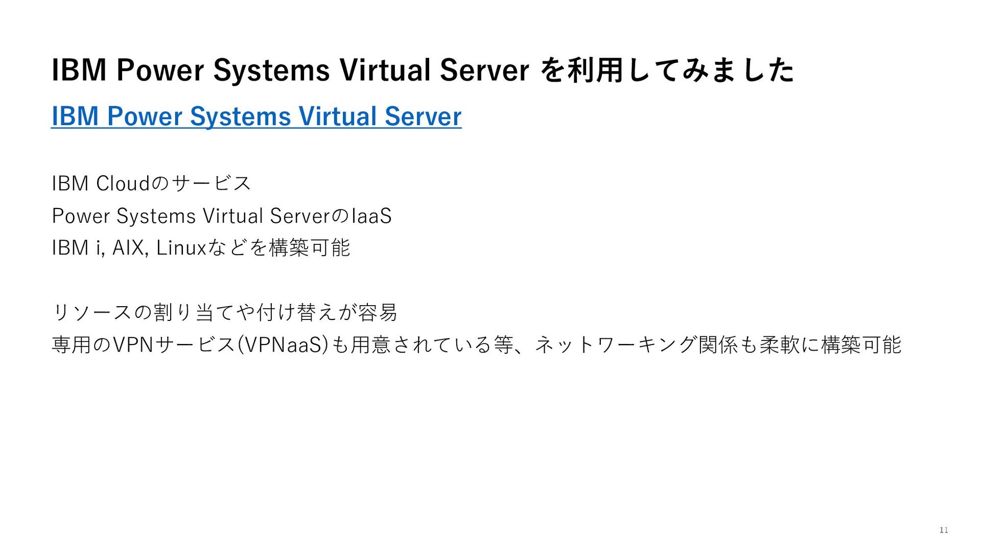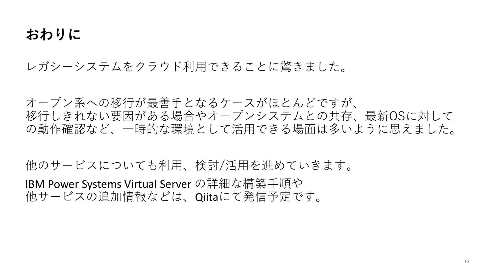 おわりに レガシーシステムをクラウド利用できることに驚きました。 オープン系への移行が最善手となるケースがほとんどですが、 移行しきれない要因がある場合やオープンシステムとの共存、最新OSに対して の動作確認など、一時的な環境として活用できる場面は多いように思えました。 他のサービスについても利用、検討/活用を進めていきます。 IBM Power Systems Virtual