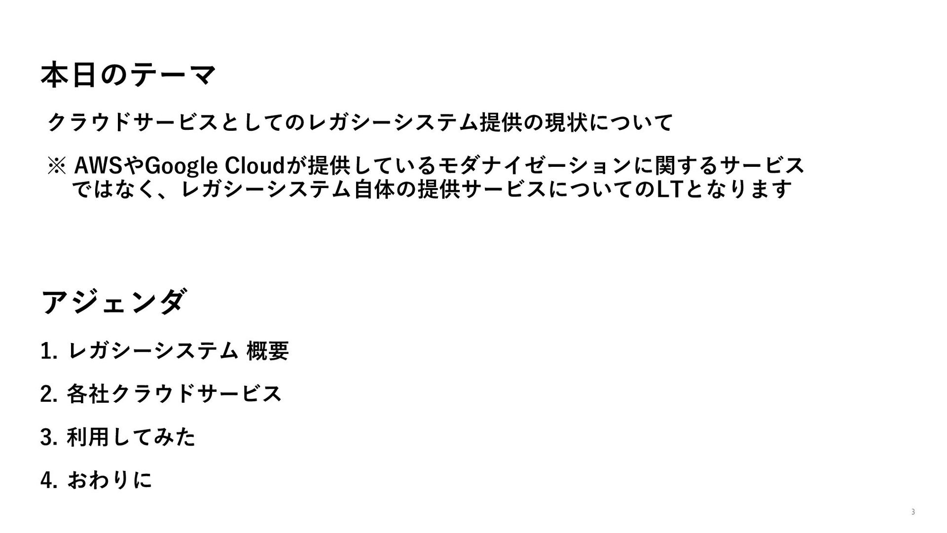 本日のテーマ クラウドサービスとしてのレガシーシステム提供の現状について ※ AWSやGoogle Cloudが提供しているモダナイゼーションに関するサービス ではなく、レガシーシステム自体の提供サービスについてのLTとなります アジェンダ 1. レガシーシステム 概要