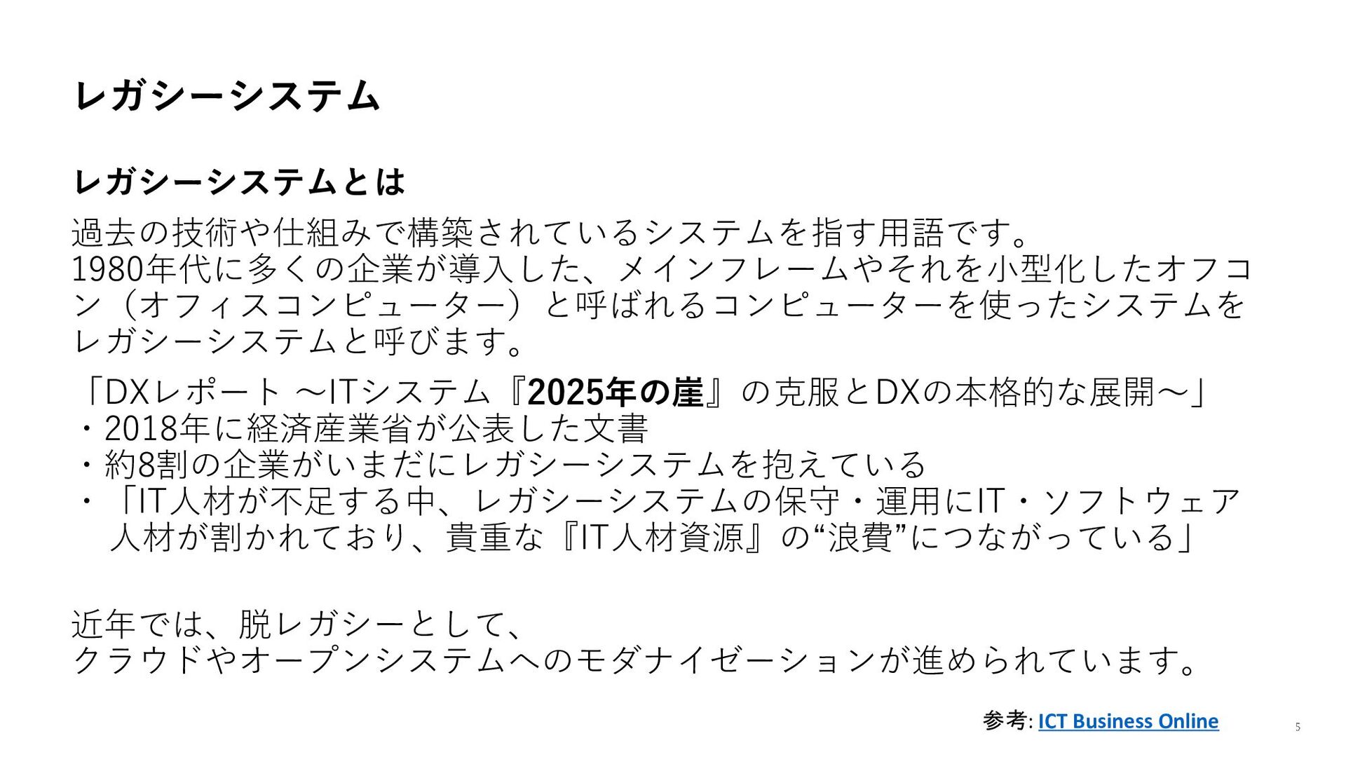レガシーシステム レガシーシステムとは 過去の技術や仕組みで構築されているシステムを指す用語です。 1980年代に多くの企業が導入した、メインフレームやそれを小型化したオフコ ン(オフィスコンピューター)と呼ばれるコンピューターを使ったシステムを レガシーシステムと呼びます。 「DXレポート ~ITシステム『2025年の崖』の克服とDXの本格的な展開~」 ・2018年に経済産業省が公表した文書 ・約8割の企業がいまだにレガシーシステムを抱えている