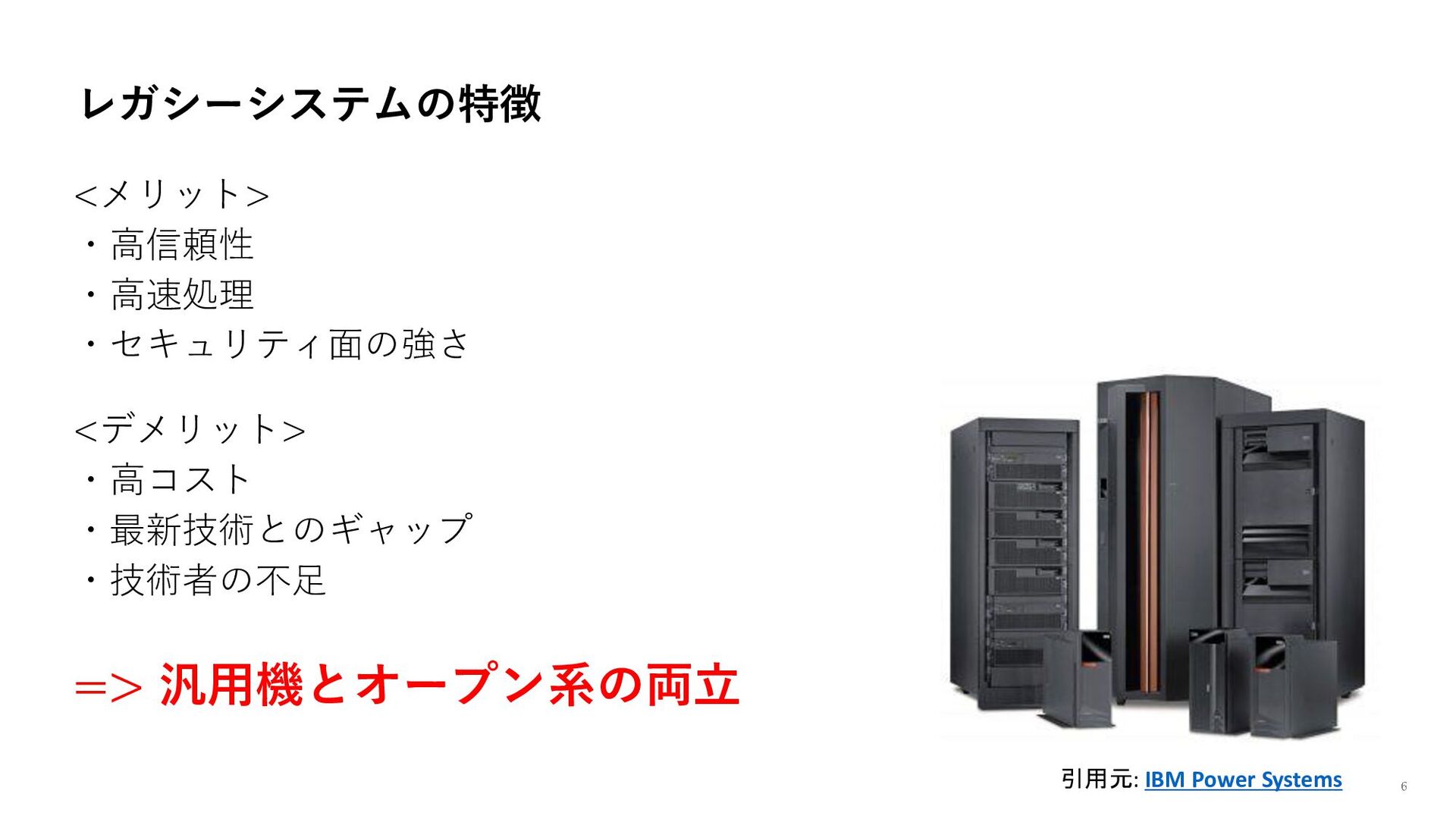 レガシーシステムの特徴 <メリット> ・高信頼性 ・高速処理 ・セキュリティ面の強さ <デメリット> ・高コスト ・最新技術とのギャップ ・技術者の不足 =>