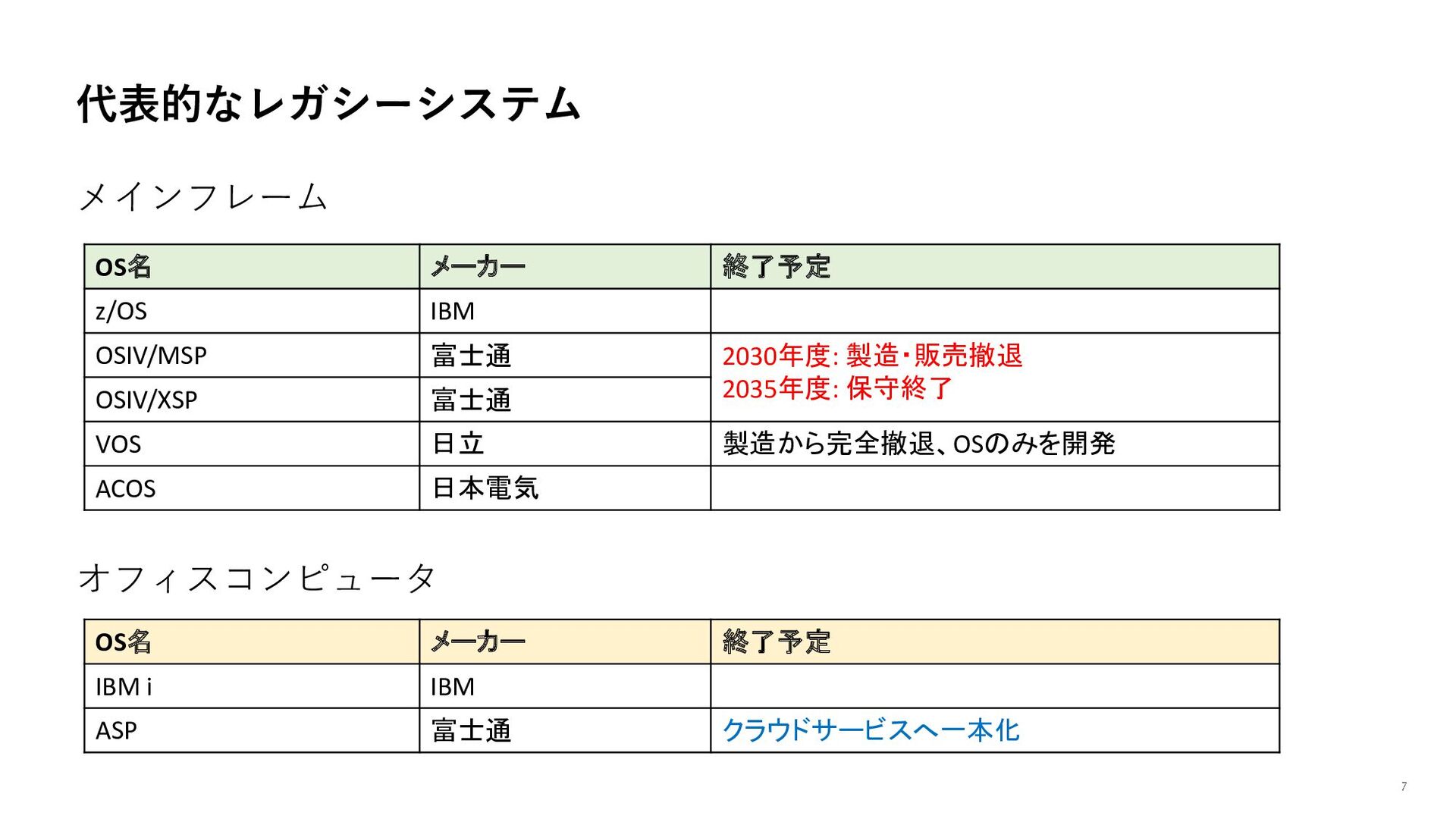 2030年度: 製造・販売撤退 2035年度: 保守終了 OSIV/XSP 富士通 VOS 日立 製造から完全撤退、OSのみを開発 ACOS 日本電気 OS名 メーカー 終了予定 IBM i IBM ASP 富士通 クラウドサービスへ一本化