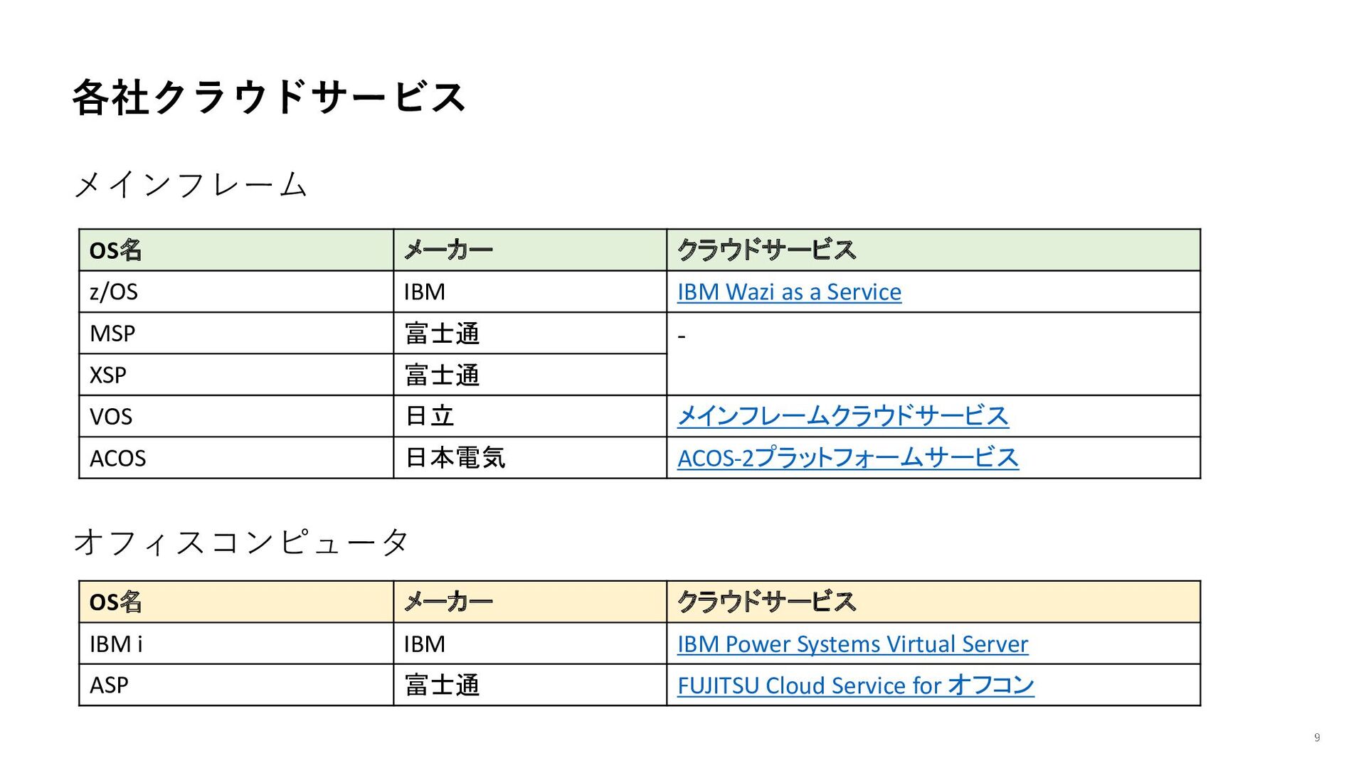 各社クラウドサービス メインフレーム オフィスコンピュータ OS名 メーカー クラウドサービス z/OS IBM IBM Wazi