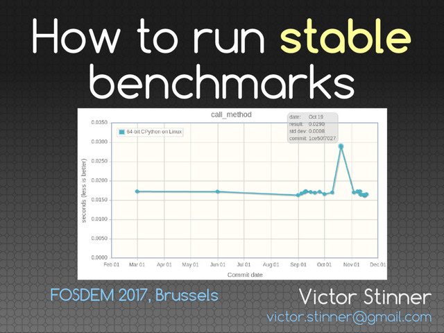 Working on optimizations is a task more complex than expected on the first look. Any optimization must be measured to make sure that, in practice, it speeds up the application task. Problem: it is very hard to obtain stable benchmark results.