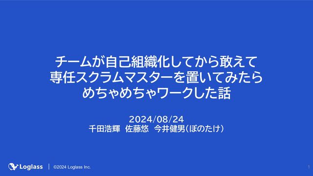1 ©2024 Loglass Inc. チームが自己組織化してから敢えて 専任スクラムマスターを置いてみたら めちゃめちゃワークした話 2024/08/24 千田浩輝 佐藤悠 今井健男(ぼのたけ)