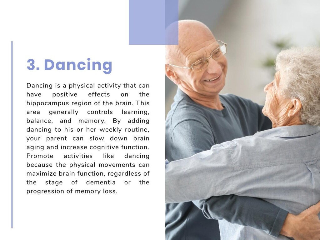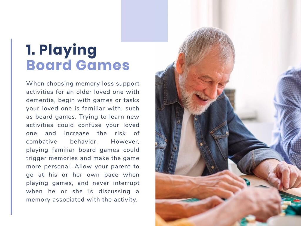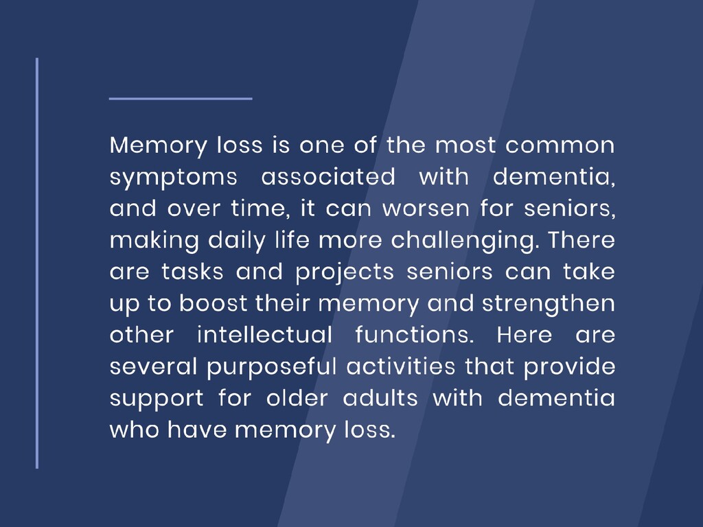 Among older adults with dementia, memory loss is one of the most common symptoms. Your loved one can boost his or her memory function with these activities