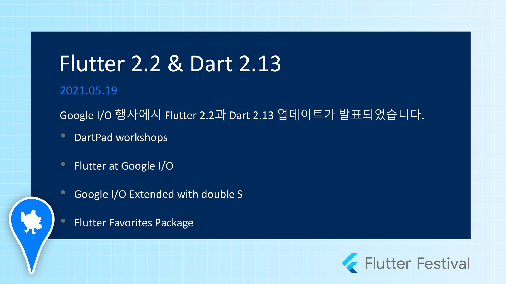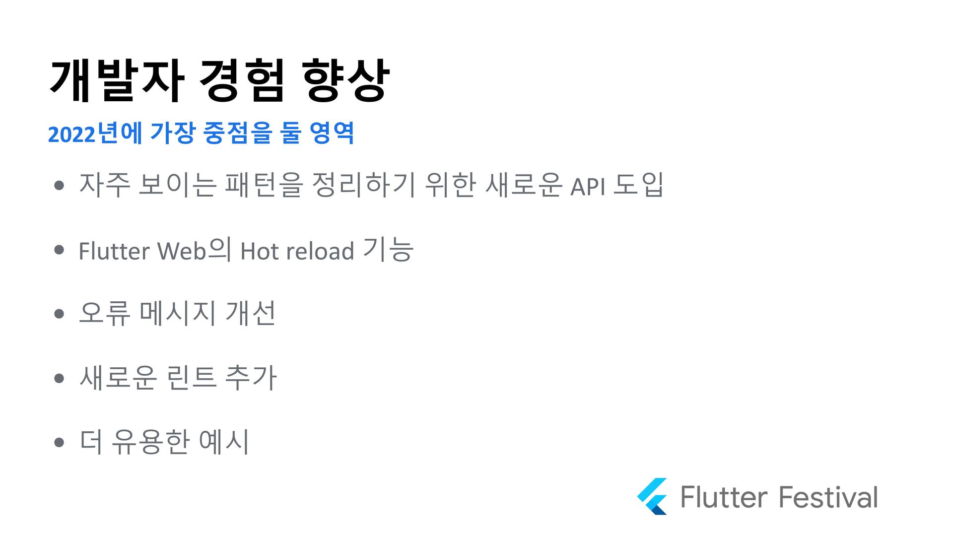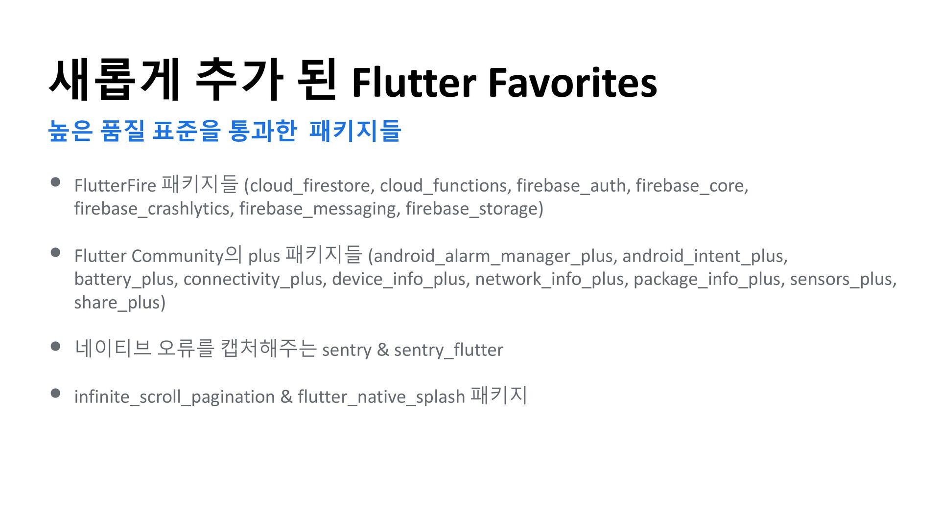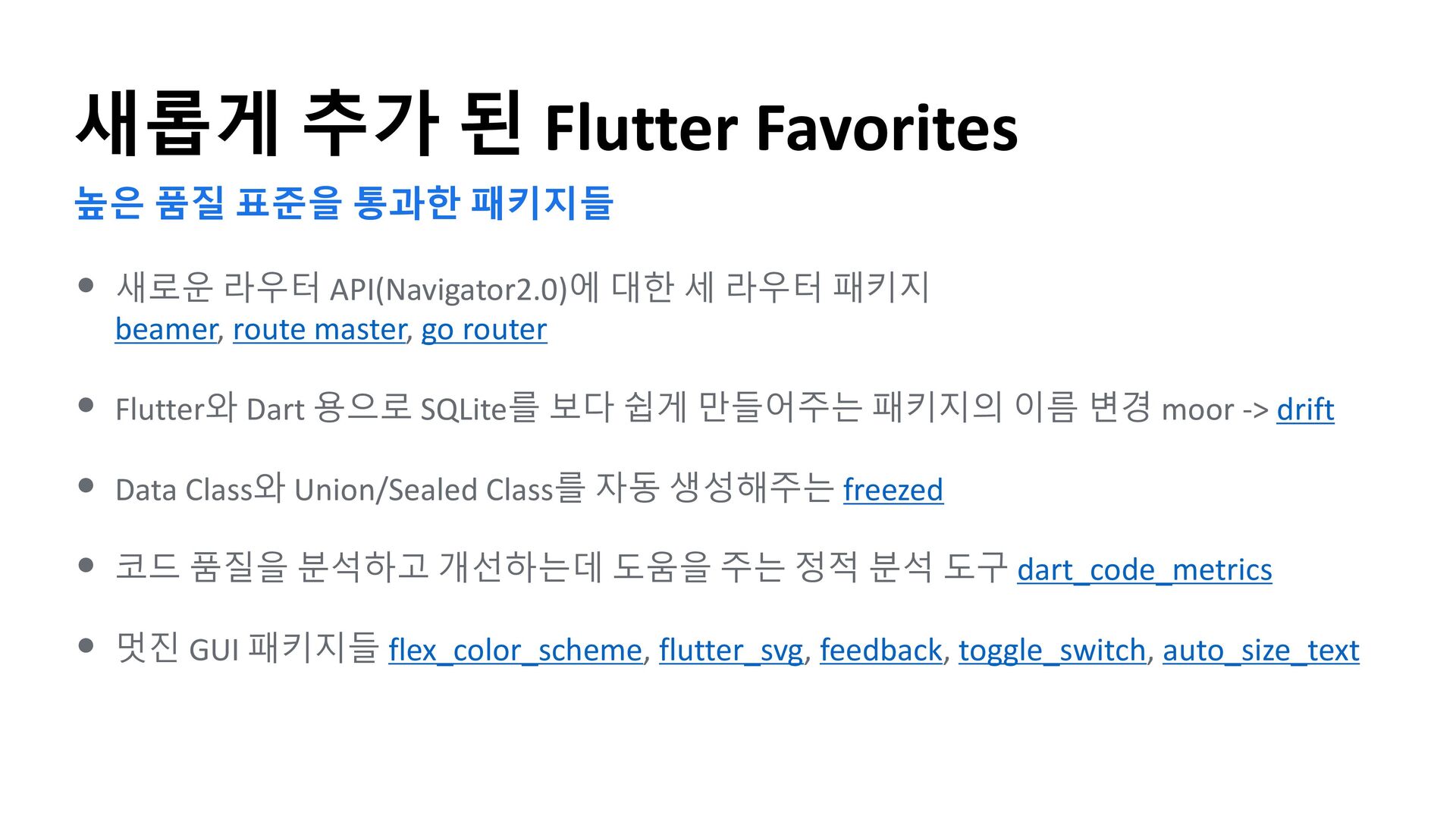 • 새로운 라우터 API(Navigator2.0)에 대한 세 라우터 패키지 beamer, route master, go router • Flutter와 Dart 용으로 SQLite를 보다 쉽게 만들어주는 패키지의 이름 변경 moor -> drift • Data Class와 Union/Sealed Class를 자동 생성해주는 freezed • 코드 품질을 분석하고 개선하는데 도움을 주는 정적 분석 도구 dart_code_metrics • 멋진 GUI 패키지들 flex_color_scheme, flutter_svg, feedback, toggle_switch, auto_size_text