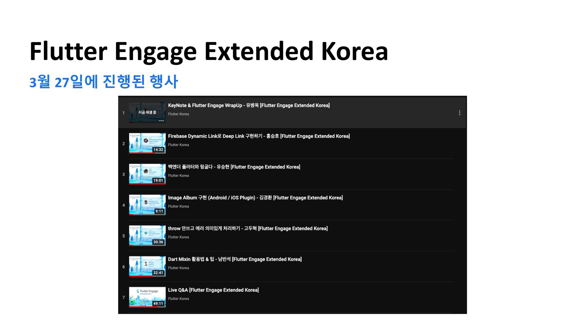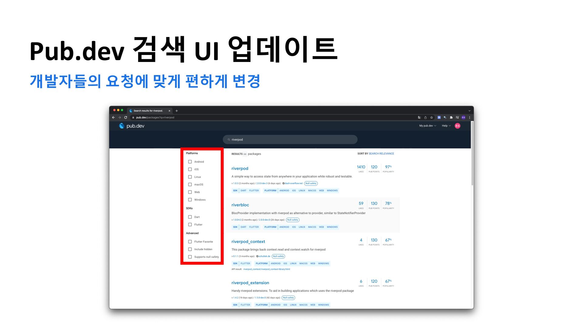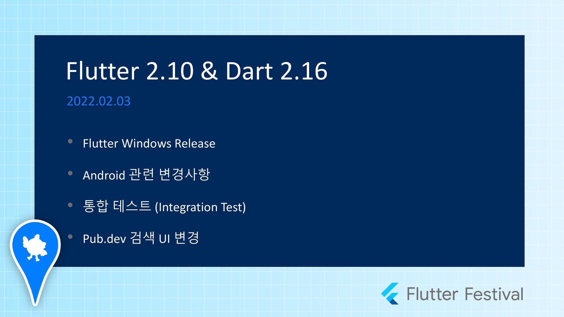 • 새로운 라우터 API(Navigator2.0)에 대한 세 라우터 패키지 beamer, route master, go router • Flutter와 Dart 용으로 SQLite를 보다 쉽게 만들어주는 패키지의 이름 변경 moor -> drift • Data Class와 Union/Sealed Class를 자동 생성해주는 freezed • 코드 품질을 분석하고 개선하는데 도움을 주는 정적 분석 도구 dart_code_metrics • 멋진 GUI 패키지들 flex_color_scheme, flutter_svg, feedback, toggle_switch, auto_size_text