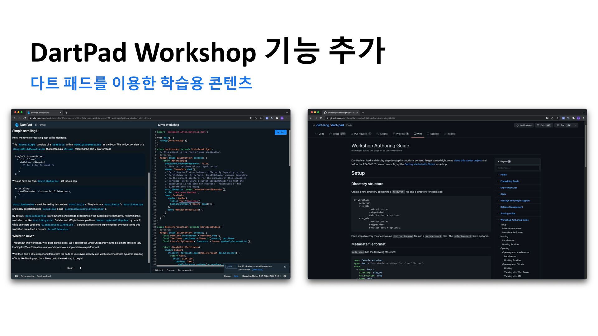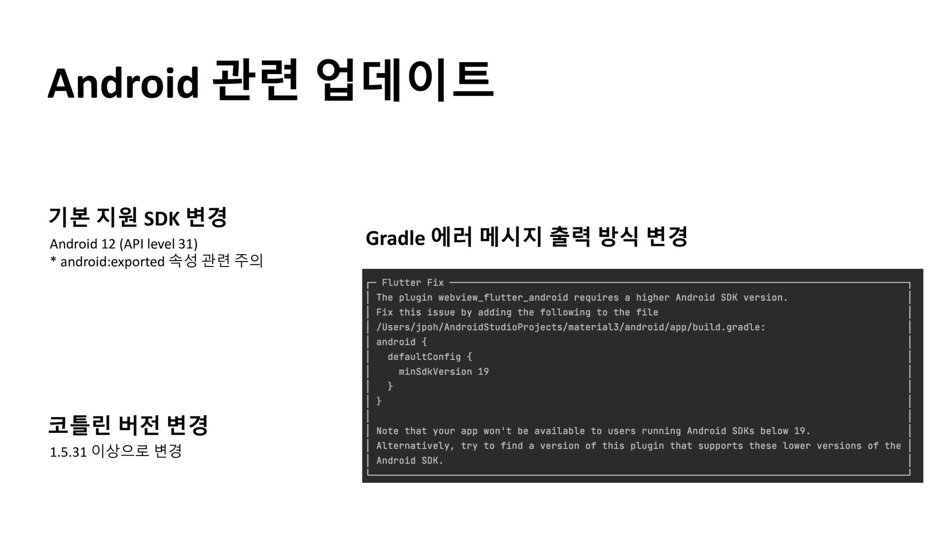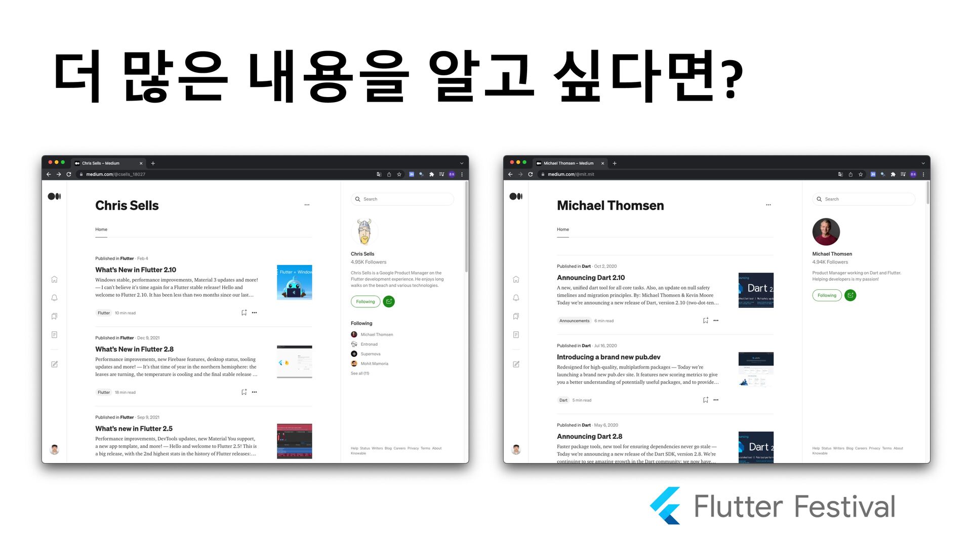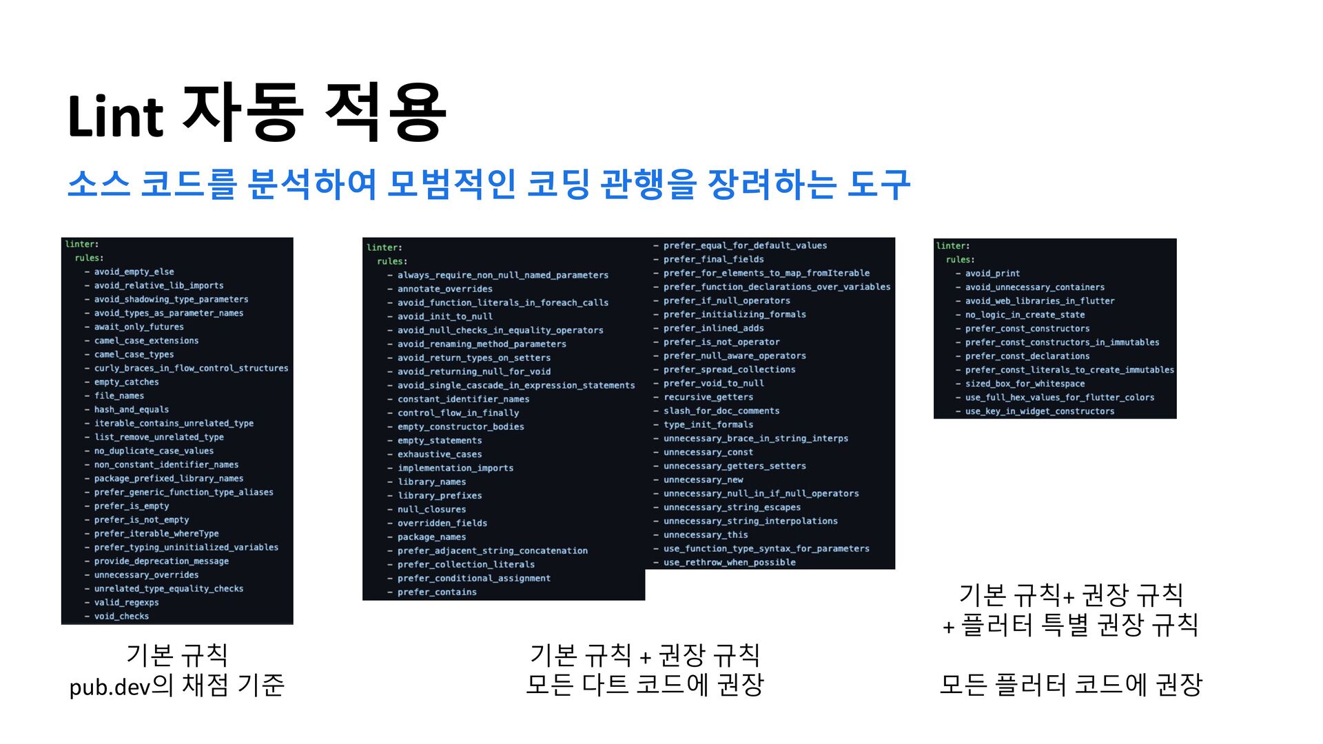 • 새로운 라우터 API(Navigator2.0)에 대한 세 라우터 패키지 beamer, route master, go router • Flutter와 Dart 용으로 SQLite를 보다 쉽게 만들어주는 패키지의 이름 변경 moor -> drift • Data Class와 Union/Sealed Class를 자동 생성해주는 freezed • 코드 품질을 분석하고 개선하는데 도움을 주는 정적 분석 도구 dart_code_metrics • 멋진 GUI 패키지들 flex_color_scheme, flutter_svg, feedback, toggle_switch, auto_size_text