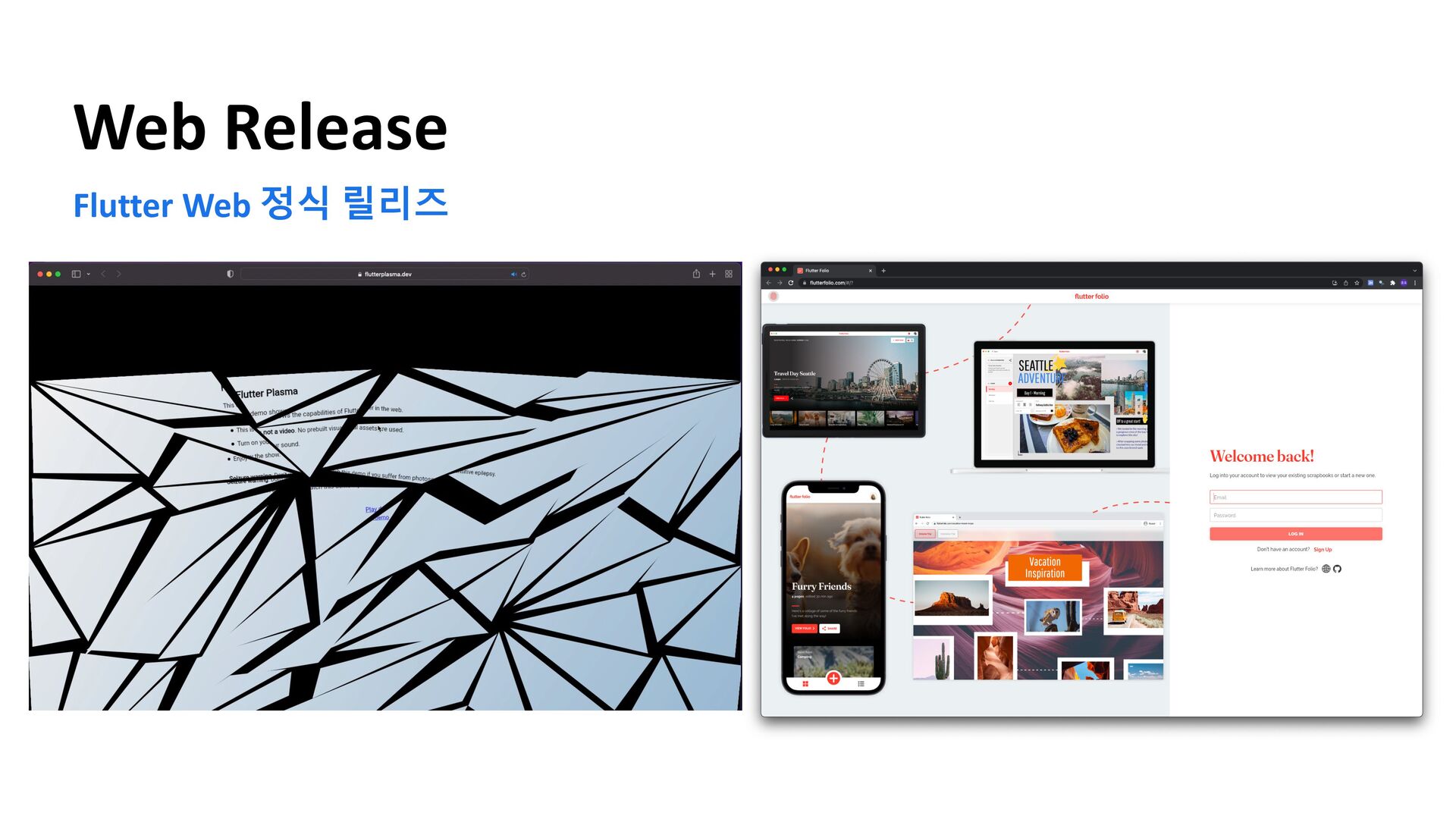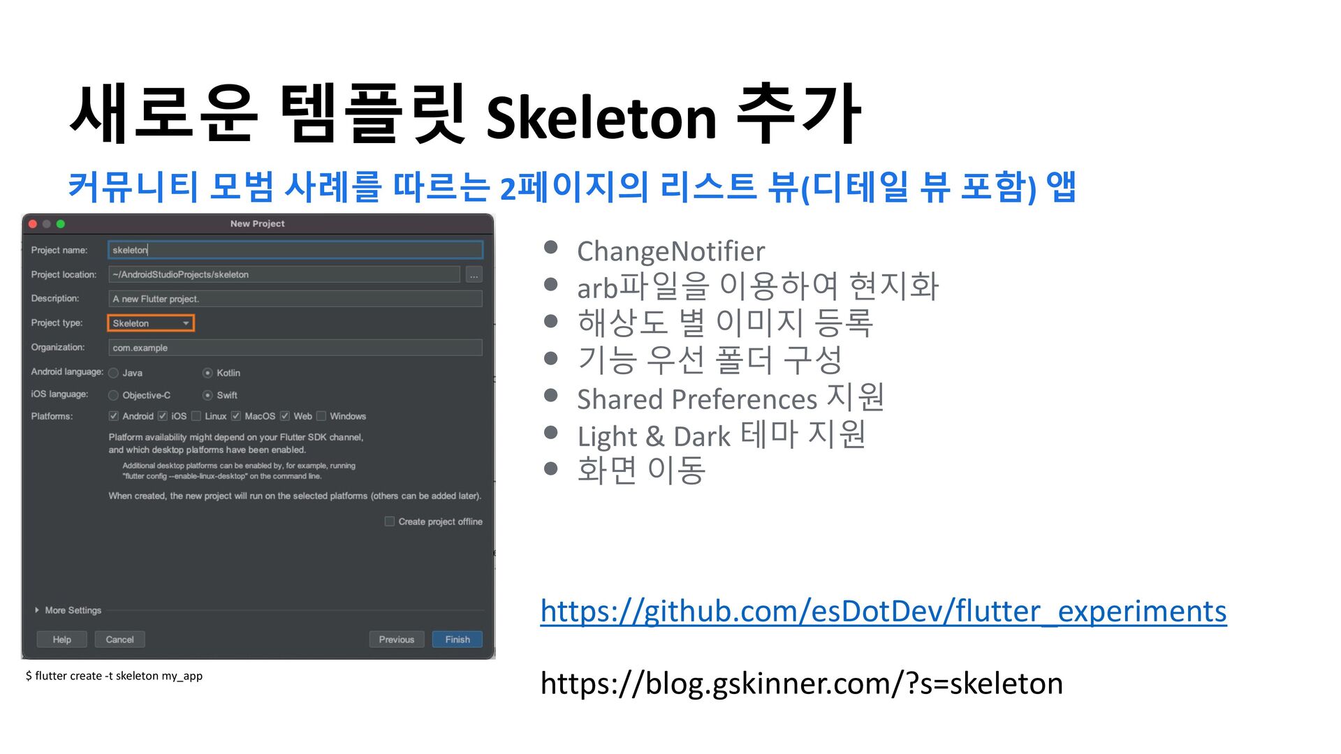 뷰(디테일 뷰 포함) 앱 $ flutter create -t skeleton my_app • ChangeNotifier • arb파일을 이용하여 현지화 • 해상도 별 이미지 등록 • 기능 우선 폴더 구성 • Shared Preferences 지원 • Light & Dark 테마 지원 • 화면 이동 https://github.com/esDotDev/flutter_experiments https://blog.gskinner.com/?s=skeleton
