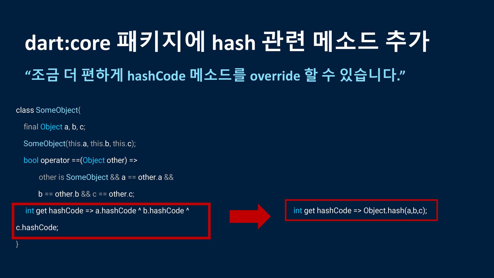 bool operator ==(Object other) => other is SomeObject && a == other.a && b == other.b && c == other.c; int get hashCode => a.hashCode ^ b.hashCode ^ c.hashCode; } dart:core 패키지에 hash 관련 메소드 추가 “조금 더 편하게 hashCode 메소드를 override 할 수 있습니다.” int get hashCode => Object.hash(a,b,c);