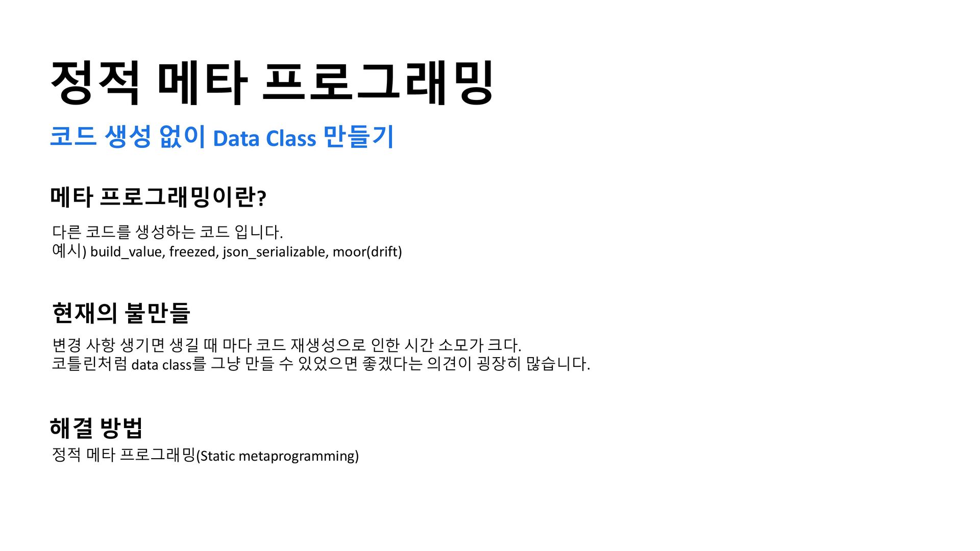 프로그래밍이란? 다른 코드를 생성하는 코드 입니다. 예시) build_value, freezed, json_serializable, moor(drift) 현재의 불만들 변경 사항 생기면 생길 때 마다 코드 재생성으로 인한 시간 소모가 크다. 코틀린처럼 data class를 그냥 만들 수 있었으면 좋겠다는 의견이 굉장히 많습니다. 해결 방법 정적 메타 프로그래밍(Static metaprogramming)