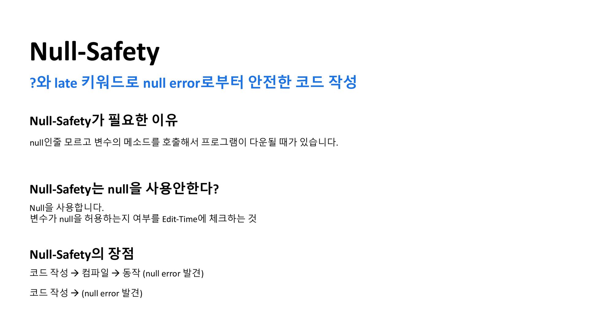 필요한 이유 null인줄 모르고 변수의 메소드를 호출해서 프로그램이 다운될 때가 있습니다. Null-Safety는 null을 사용안한다? Null을 사용합니다. 변수가 null을 허용하는지 여부를 Edit-Time에 체크하는 것 Null-Safety의 장점 코드 작성 à 컴파일 à 동작 (null error 발견) 코드 작성 à (null error 발견)