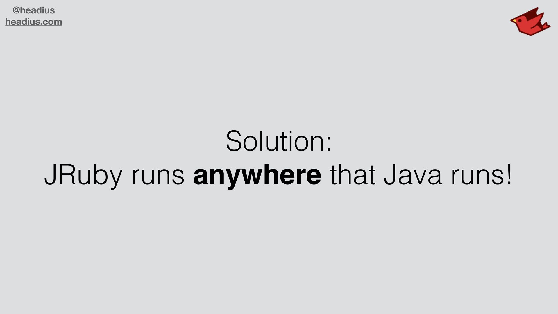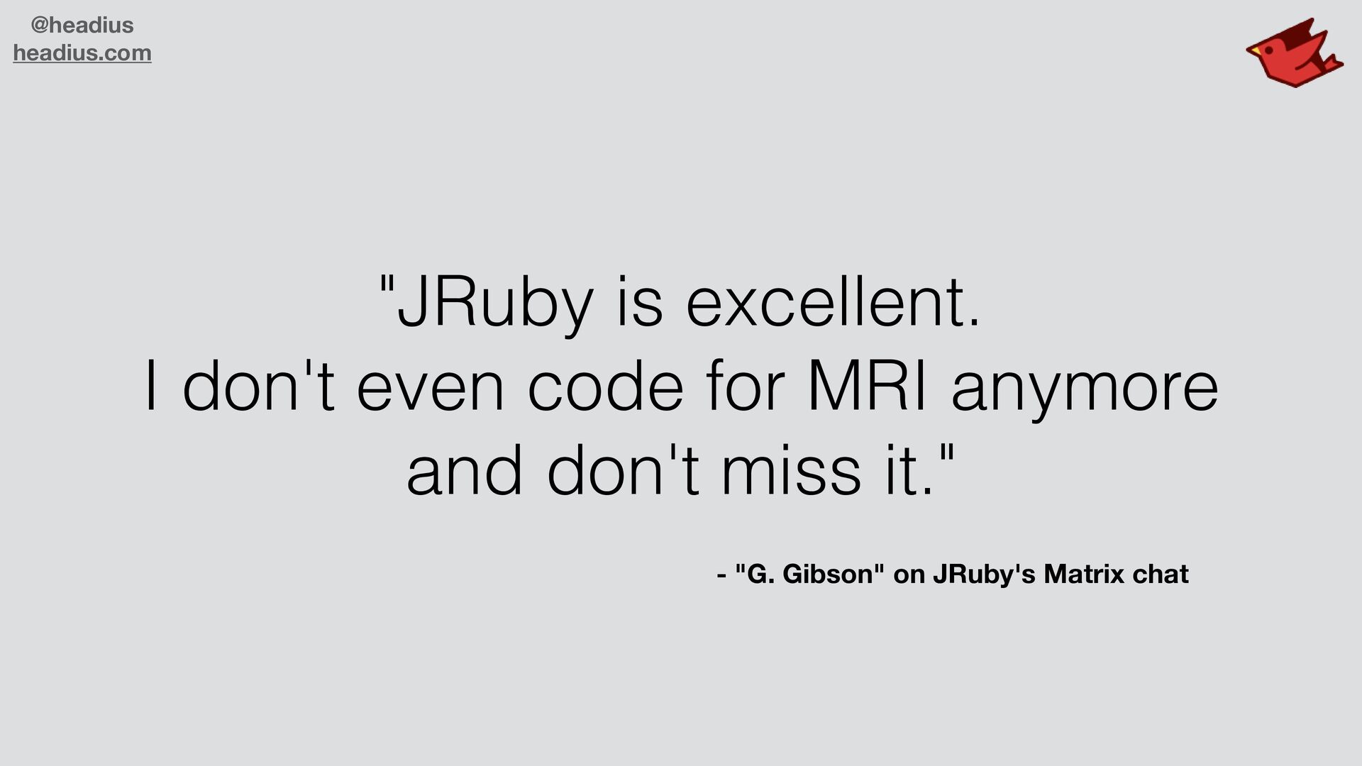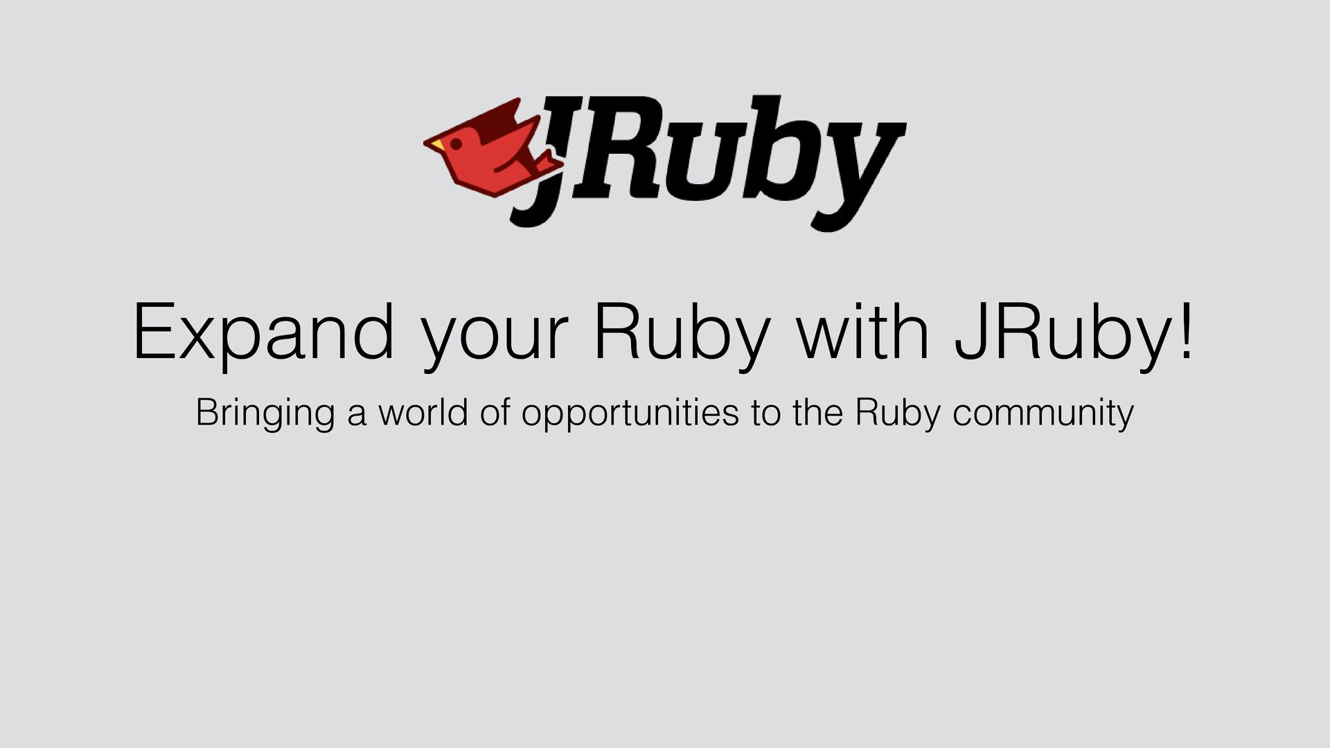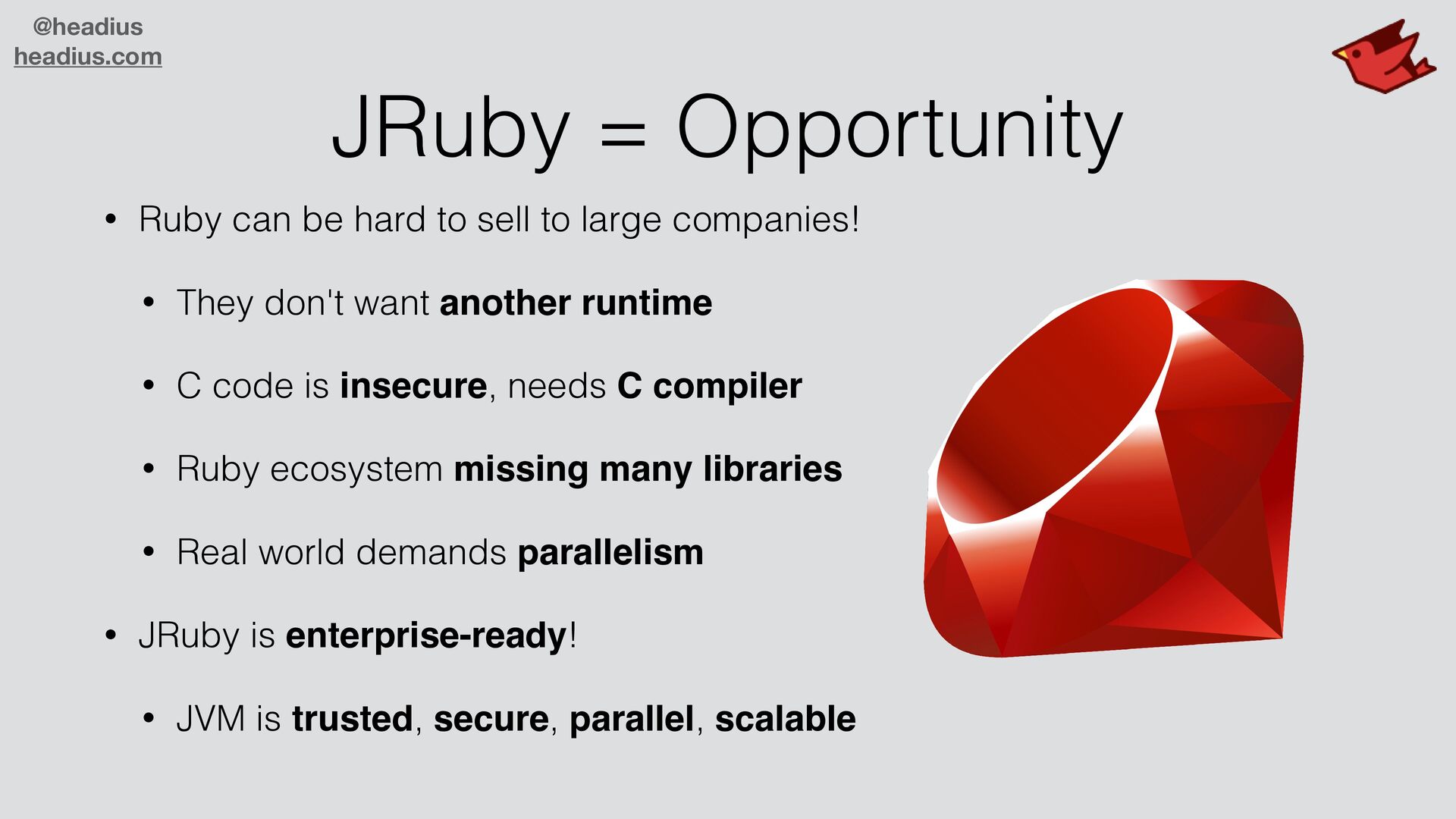 to sell to large companies! • They don't want another runtime • C code is insecure, needs C compiler • Ruby ecosystem missing many libraries • Real world demands parallelism • JRuby is enterprise-ready! • JVM is trusted, secure, parallel, scalable
