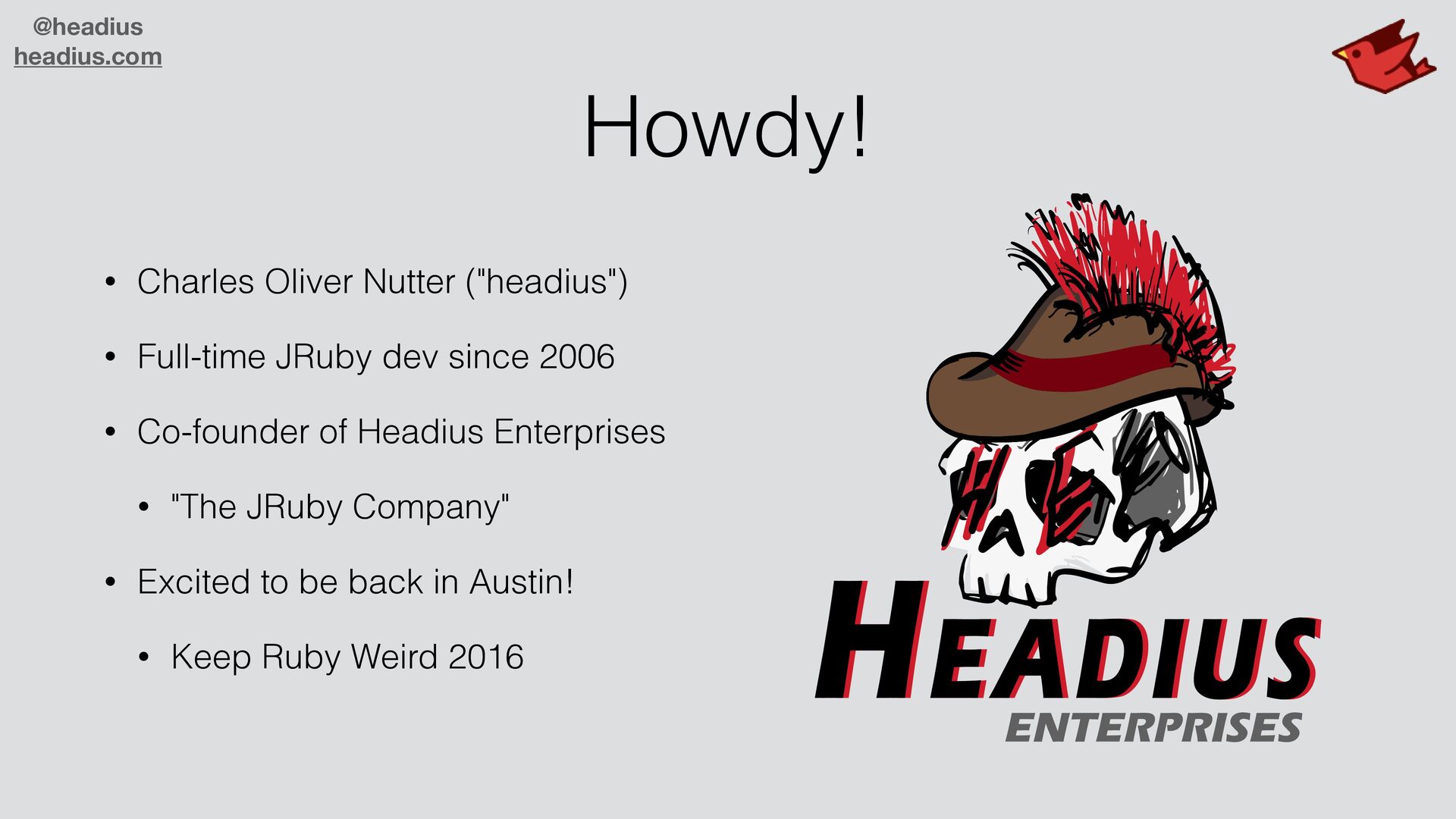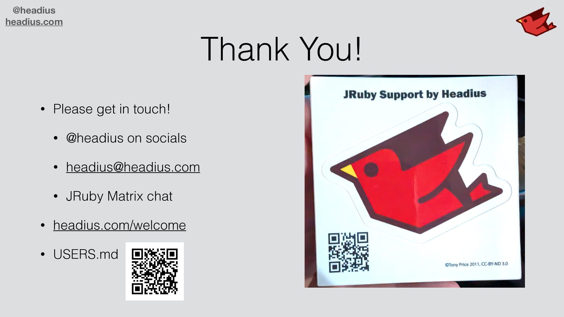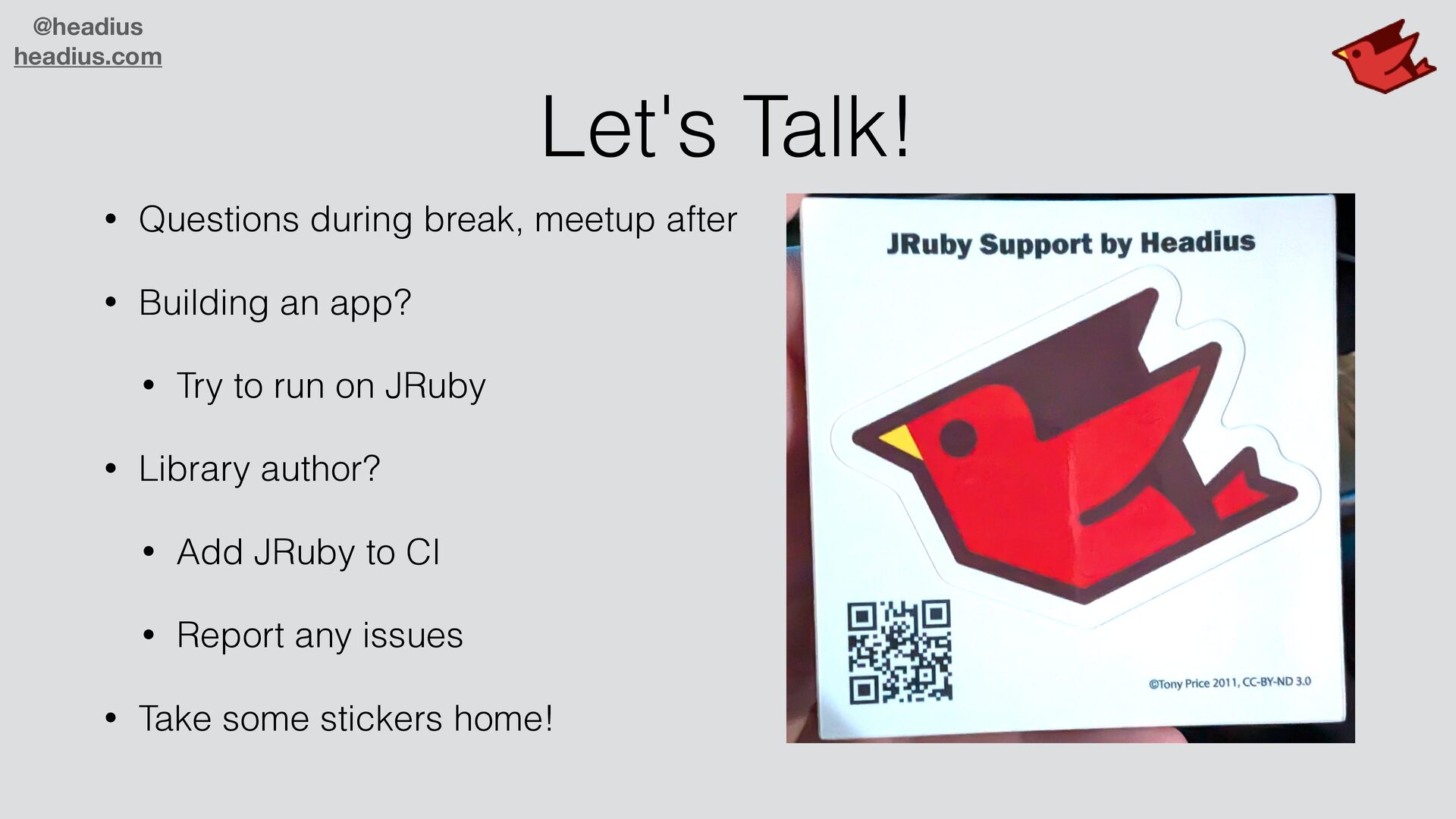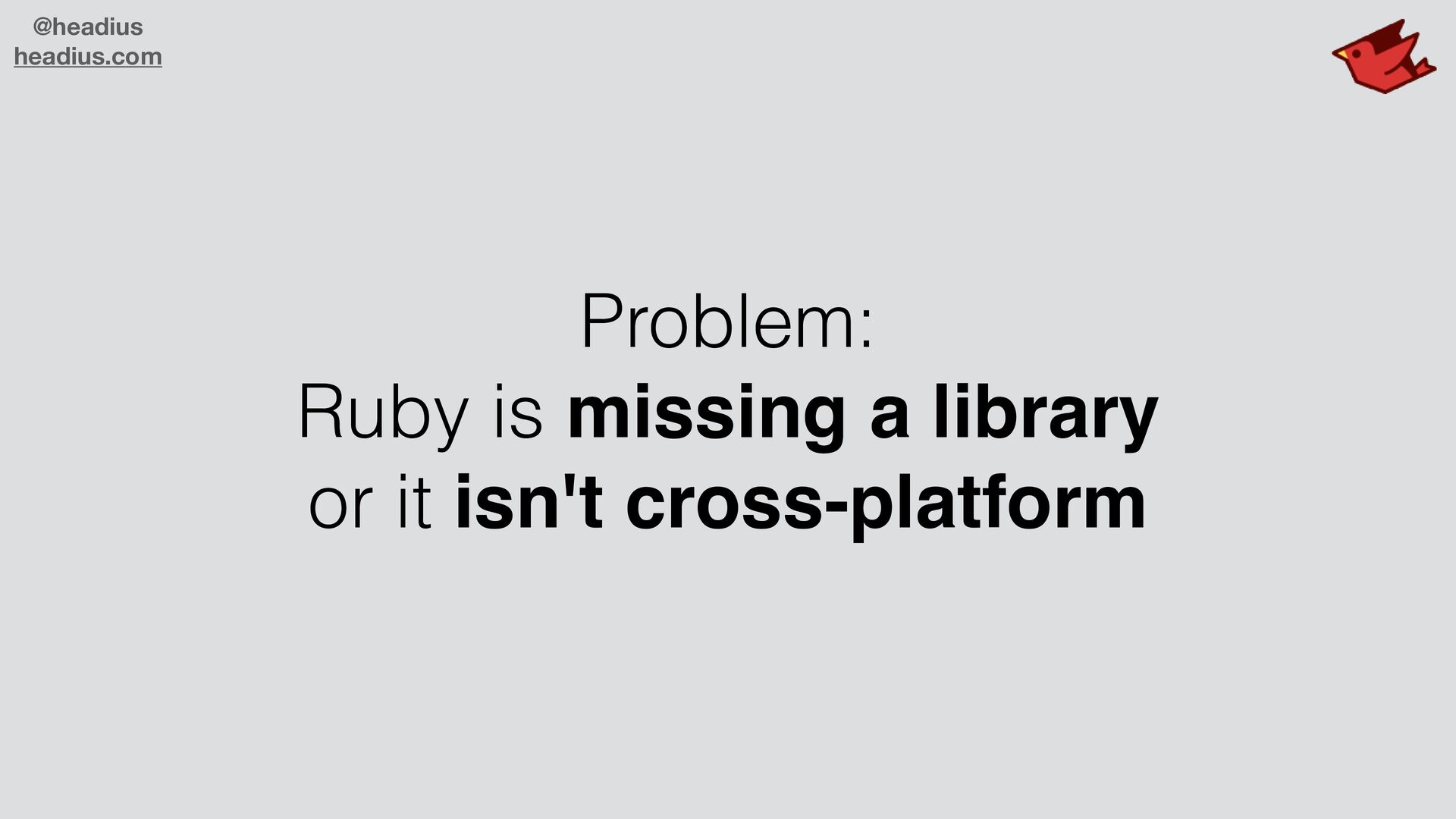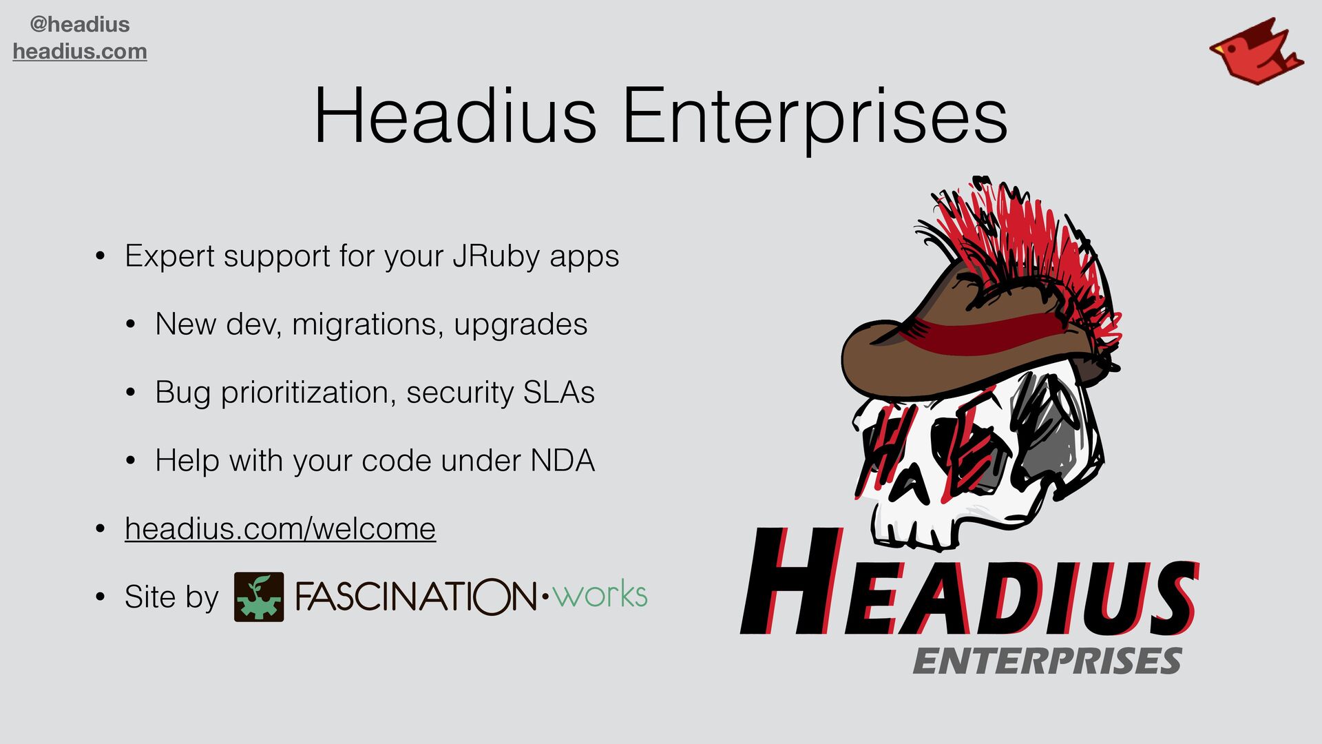 to sell to large companies! • They don't want another runtime • C code is insecure, needs C compiler • Ruby ecosystem missing many libraries • Real world demands parallelism • JRuby is enterprise-ready! • JVM is trusted, secure, parallel, scalable