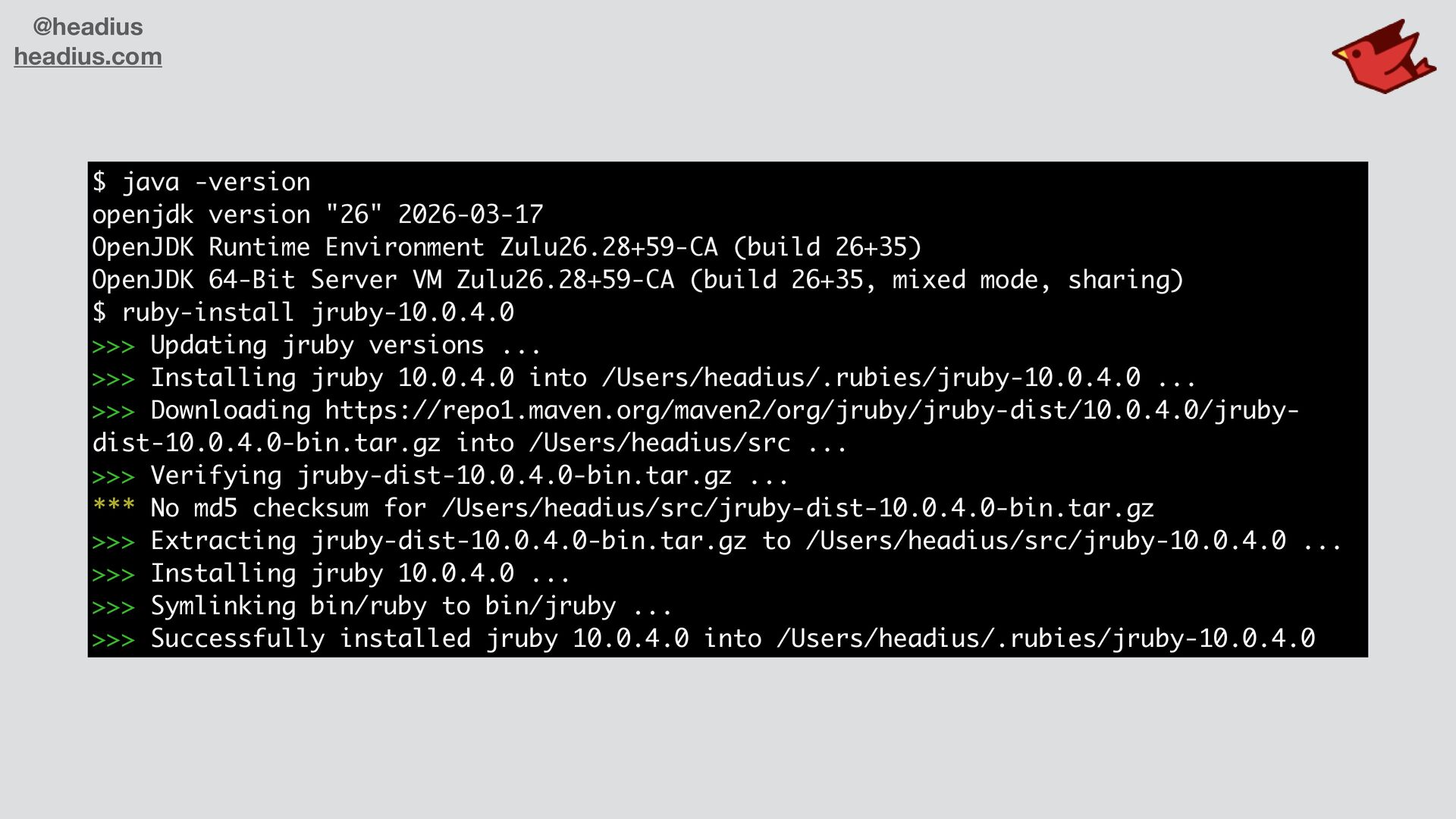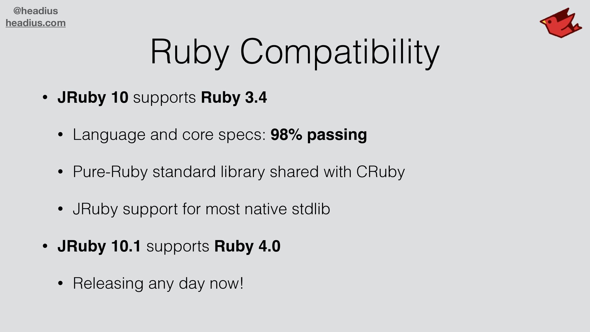 • Language and core specs: 98% passing • Pure-Ruby standard library shared with CRuby • JRuby support for most native stdlib • JRuby 10.1 supports Ruby 4.0 • Releasing any day now!