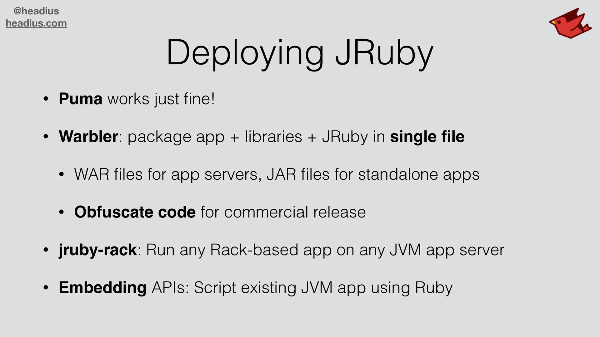 • Warbler: package app + libraries + JRuby in single fi le • WAR fi les for app servers, JAR fi les for standalone apps • Obfuscate code for commercial release • jruby-rack: Run any Rack-based app on any JVM app server • Embedding APIs: Script existing JVM app using Ruby