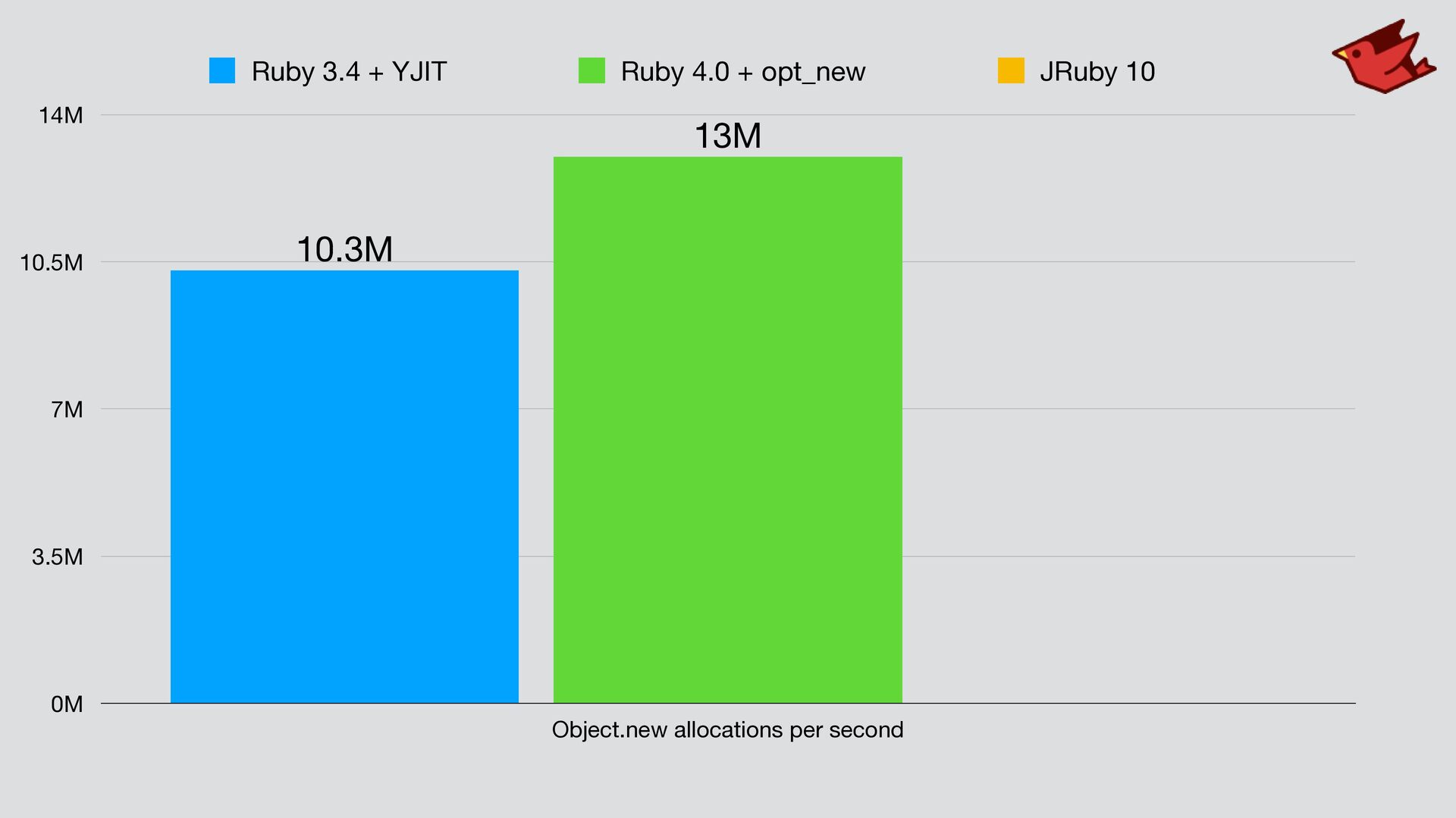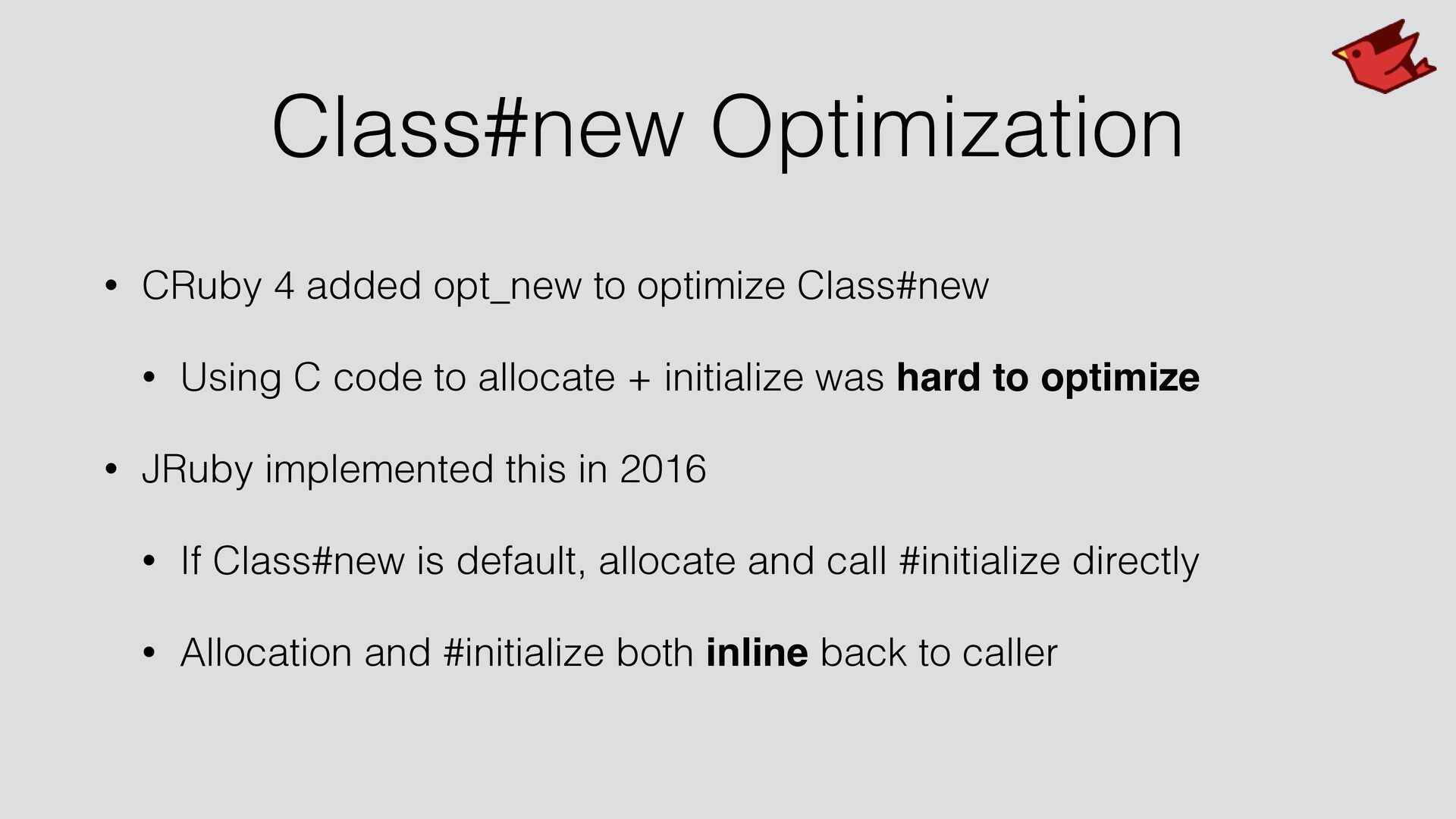 • Using C code to allocate + initialize was hard to optimize • JRuby implemented this in 2016 • If Class#new is default, allocate and call #initialize directly • Allocation and #initialize both inline back to caller
