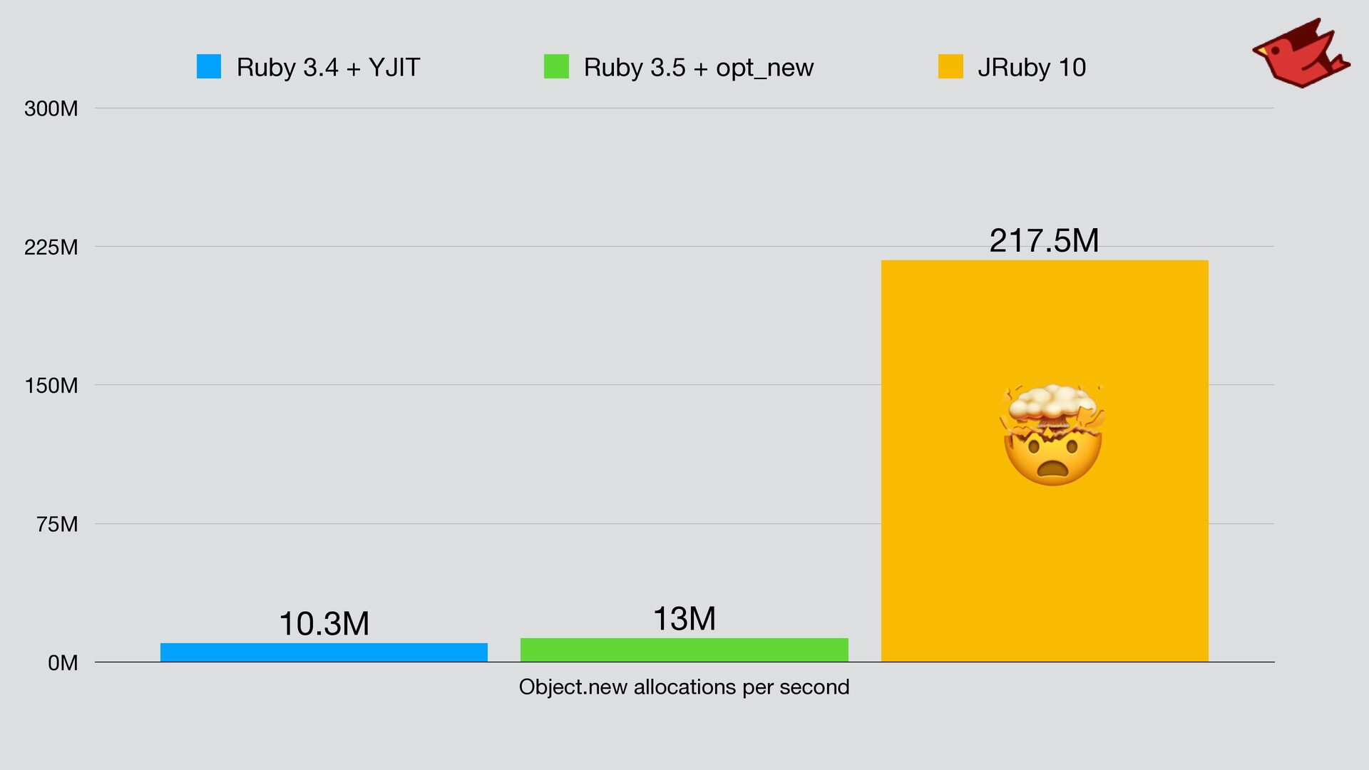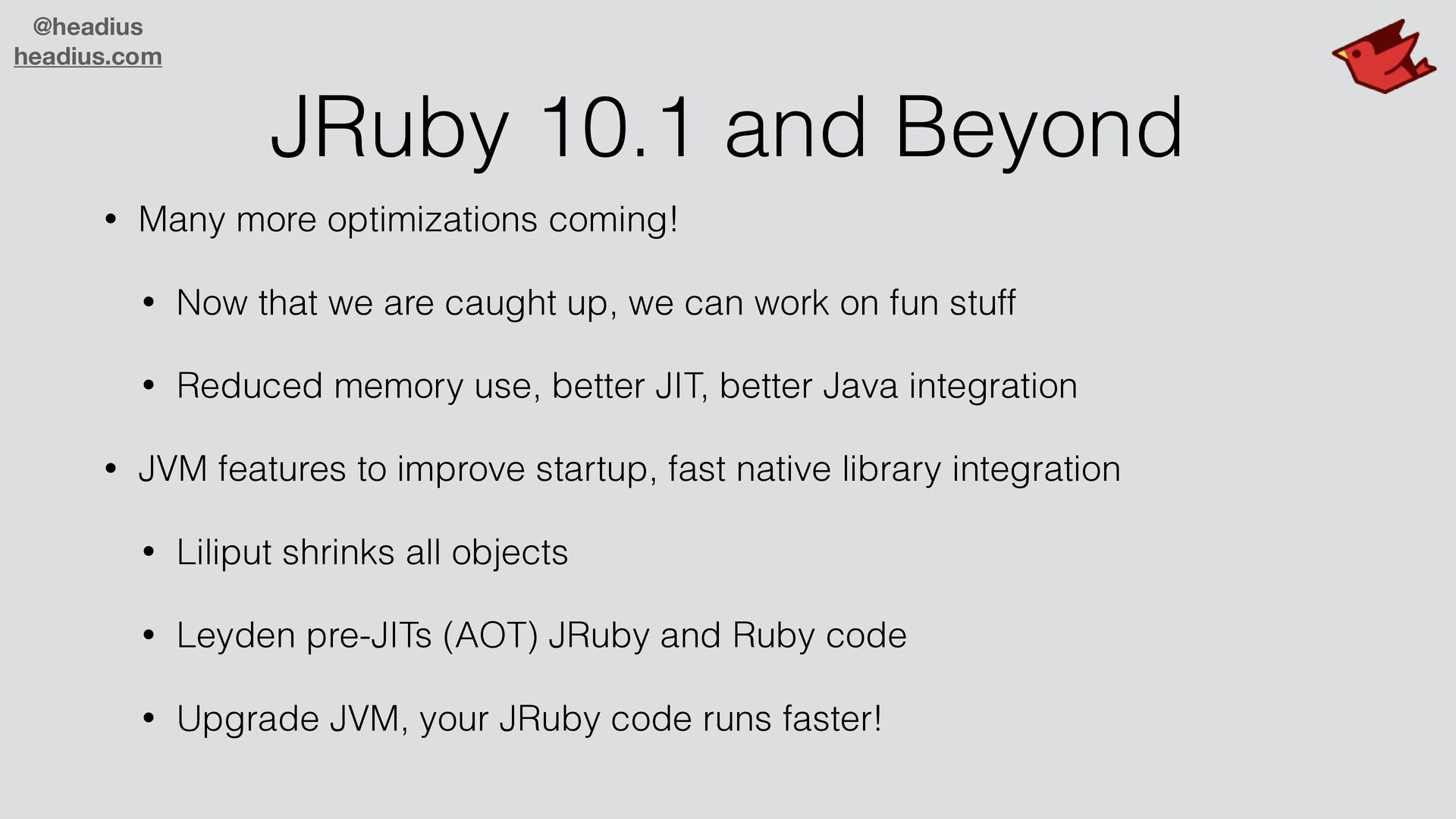 coming! • Now that we are caught up, we can work on fun stuff • Reduced memory use, better JIT, better Java integration • JVM features to improve startup, fast native library integration • Liliput shrinks all objects • Leyden pre-JITs (AOT) JRuby and Ruby code • Upgrade JVM, your JRuby code runs faster!