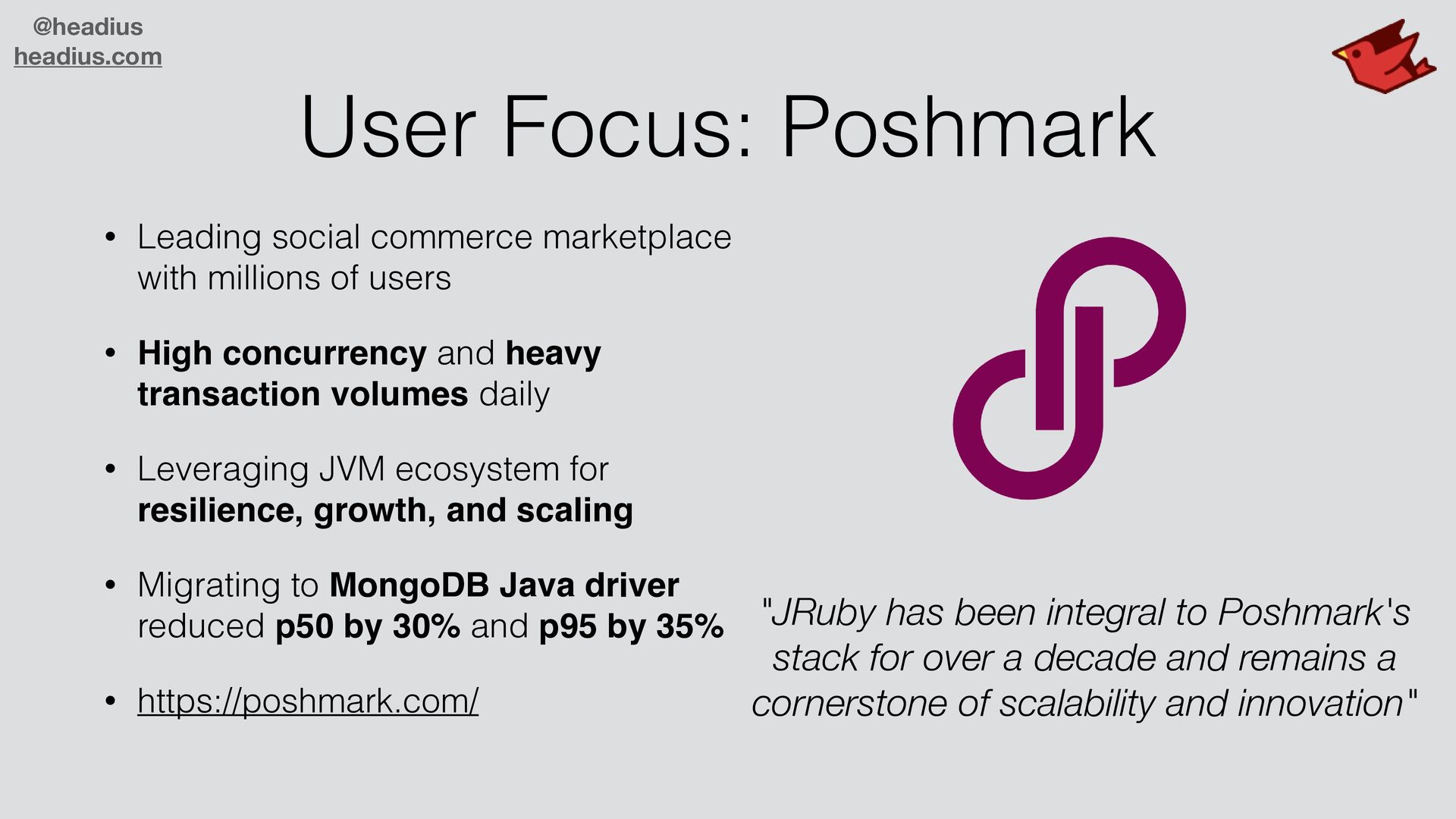 with millions of users • High concurrency and heavy transaction volumes daily • Leveraging JVM ecosystem for resilience, growth, and scaling • Migrating to MongoDB Java driver reduced p50 by 30% and p95 by 35% • https://poshmark.com/ "JRuby has been integral to Poshmark's stack for over a decade and remains a cornerstone of scalability and innovation"