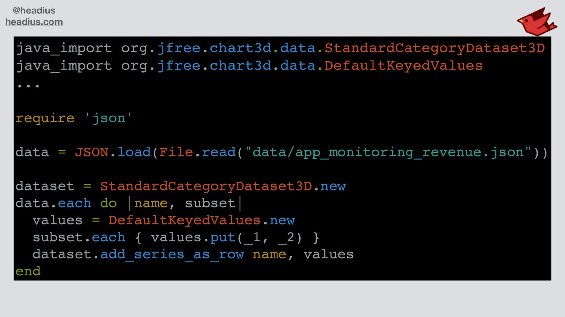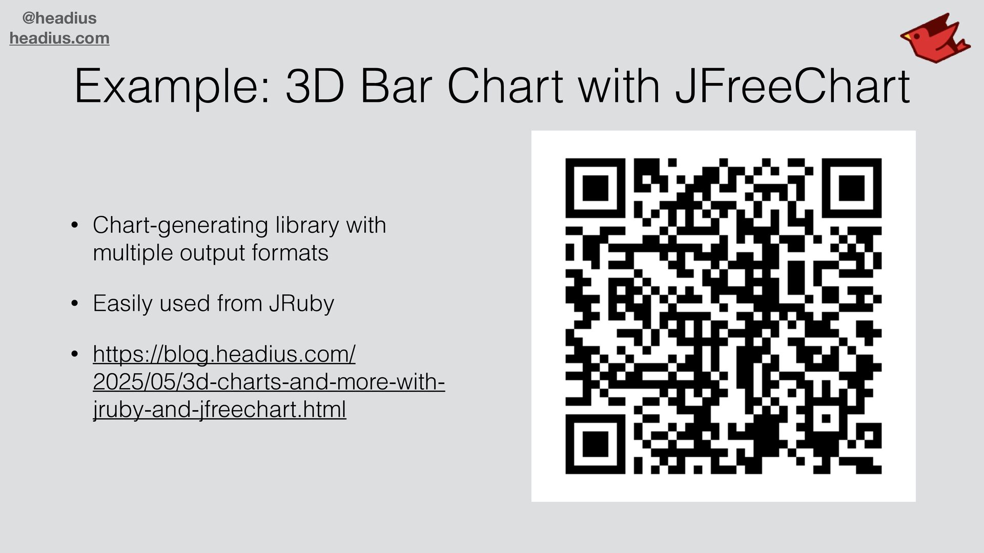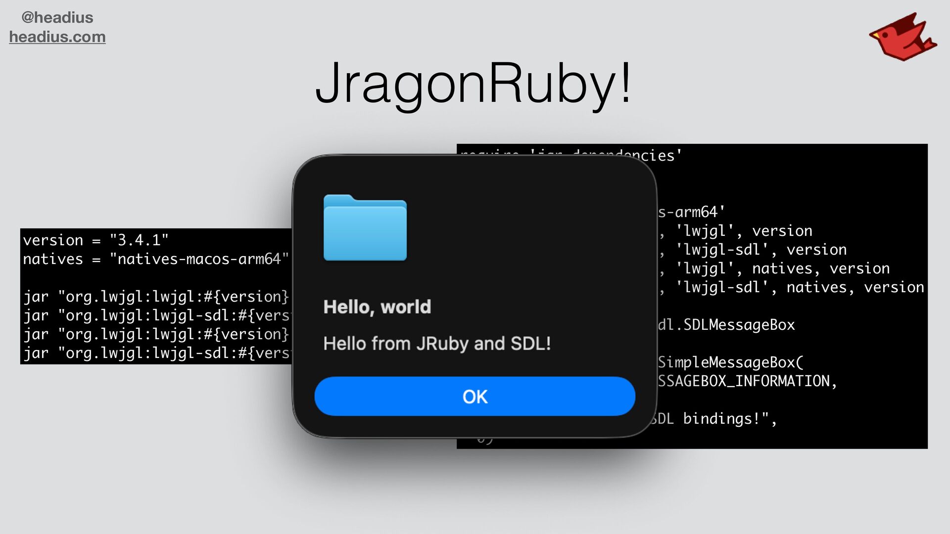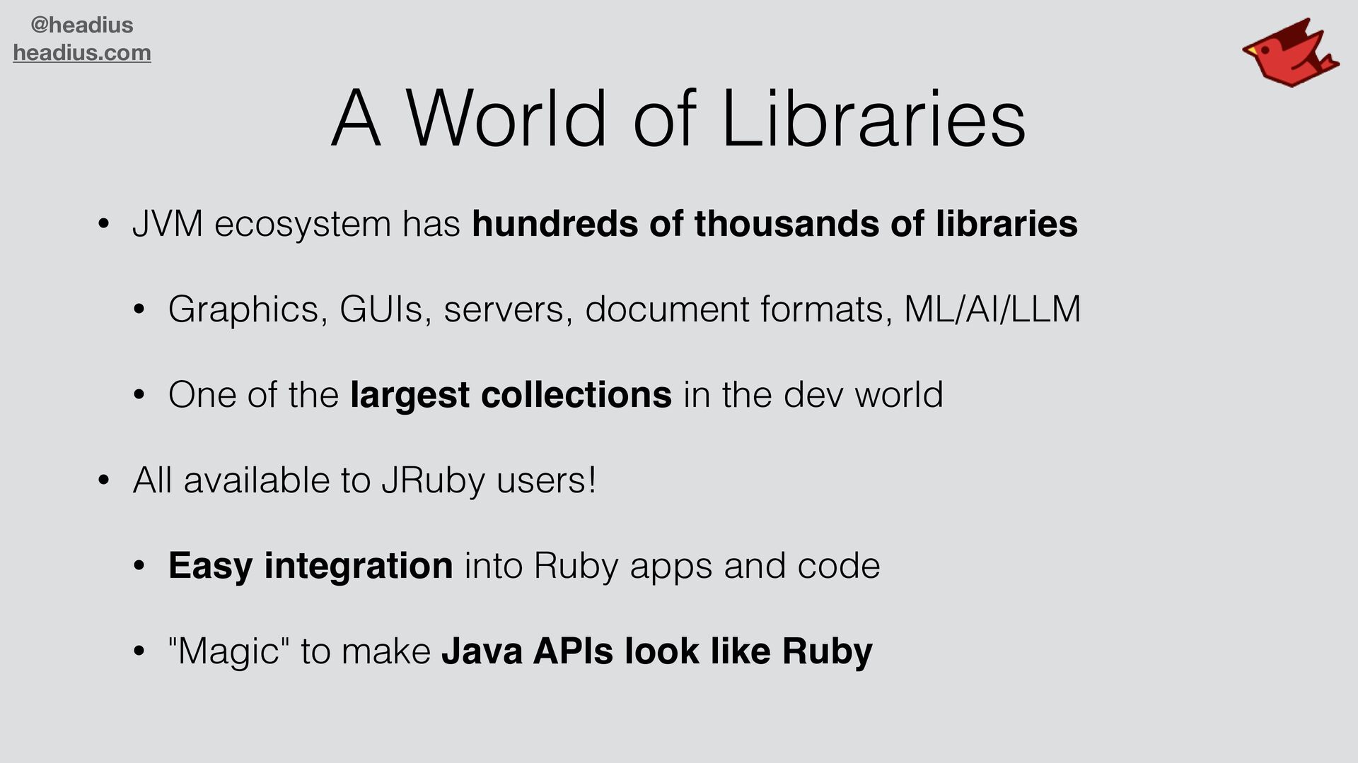 hundreds of thousands of libraries • Graphics, GUIs, servers, document formats, ML/AI/LLM • One of the largest collections in the dev world • All available to JRuby users! • Easy integration into Ruby apps and code • "Magic" to make Java APIs look like Ruby