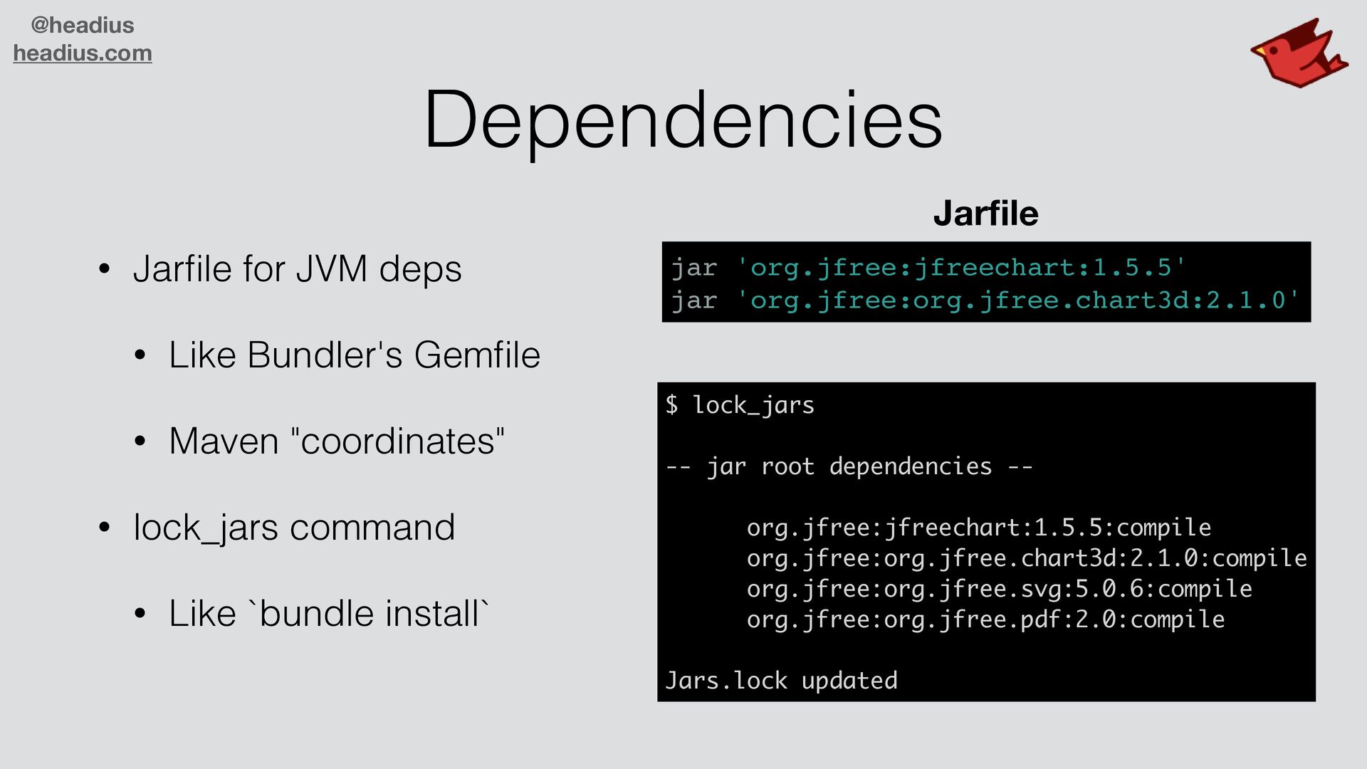 • Like Bundler's Gem fi le • Maven "coordinates" • lock_jars command • Like `bundle install` jar 'org.jfree:jfreechart:1.5.5' jar 'org.jfree:org.jfree.chart3d:2.1.0' $ lock_jars -- jar root dependencies -- org.jfree:jfreechart:1.5.5:compile org.jfree:org.jfree.chart3d:2.1.0:compile org.jfree:org.jfree.svg:5.0.6:compile org.jfree:org.jfree.pdf:2.0:compile Jars.lock updated Jar fi le
