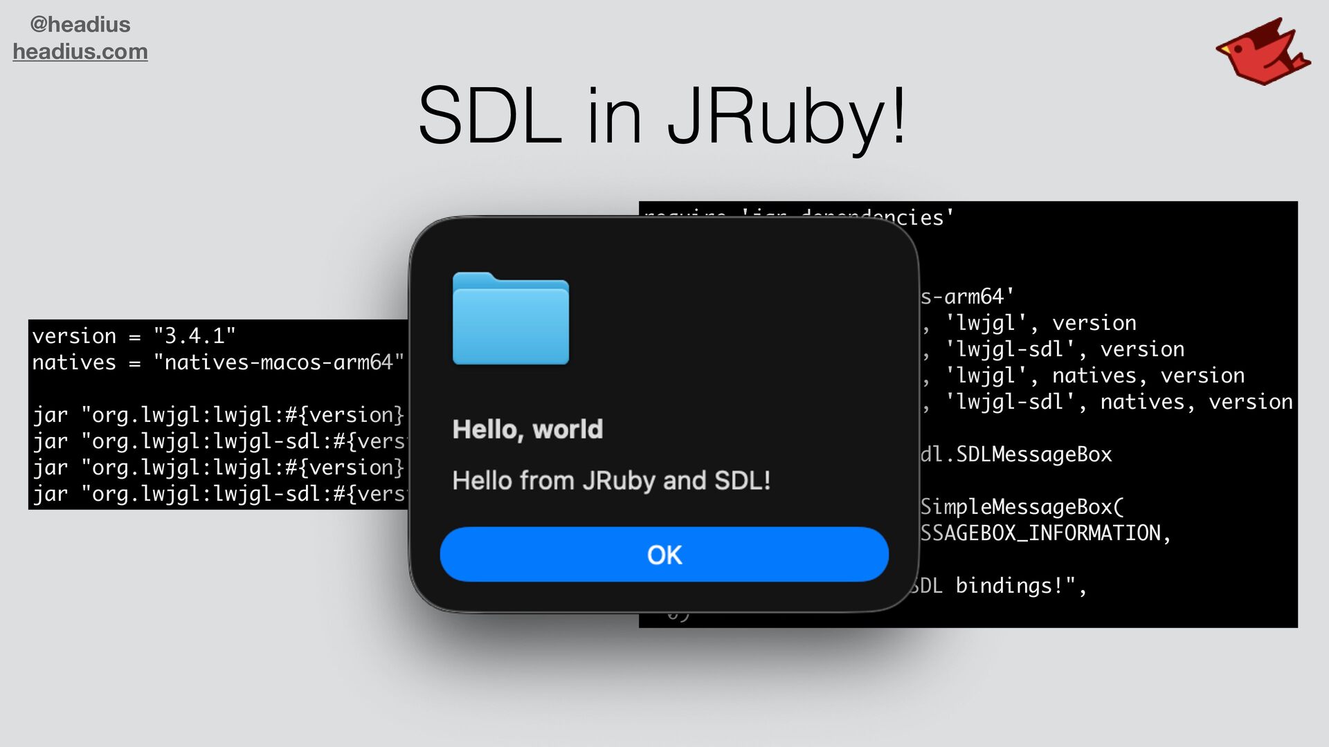 "org.lwjgl:lwjgl:#{version}" jar "org.lwjgl:lwjgl-sdl:#{version}" jar "org.lwjgl:lwjgl:#{version}:#{natives}" jar "org.lwjgl:lwjgl-sdl:#{version}:#{natives}" require 'jar-dependencies' version = '3.4.1' natives = 'natives-macos-arm64' require_jar 'org.lwjgl', 'lwjgl', version require_jar 'org.lwjgl', 'lwjgl-sdl', version require_jar 'org.lwjgl', 'lwjgl', natives, version require_jar 'org.lwjgl', 'lwjgl-sdl', natives, version java_import org.lwjgl.sdl.SDLMessageBox SDLMessageBox::SDL_ShowSimpleMessageBox( SDLMessageBox::SDL_MESSAGEBOX_INFORMATION, "Hello, world", "Hello from LWJGL's SDL bindings!", 0)