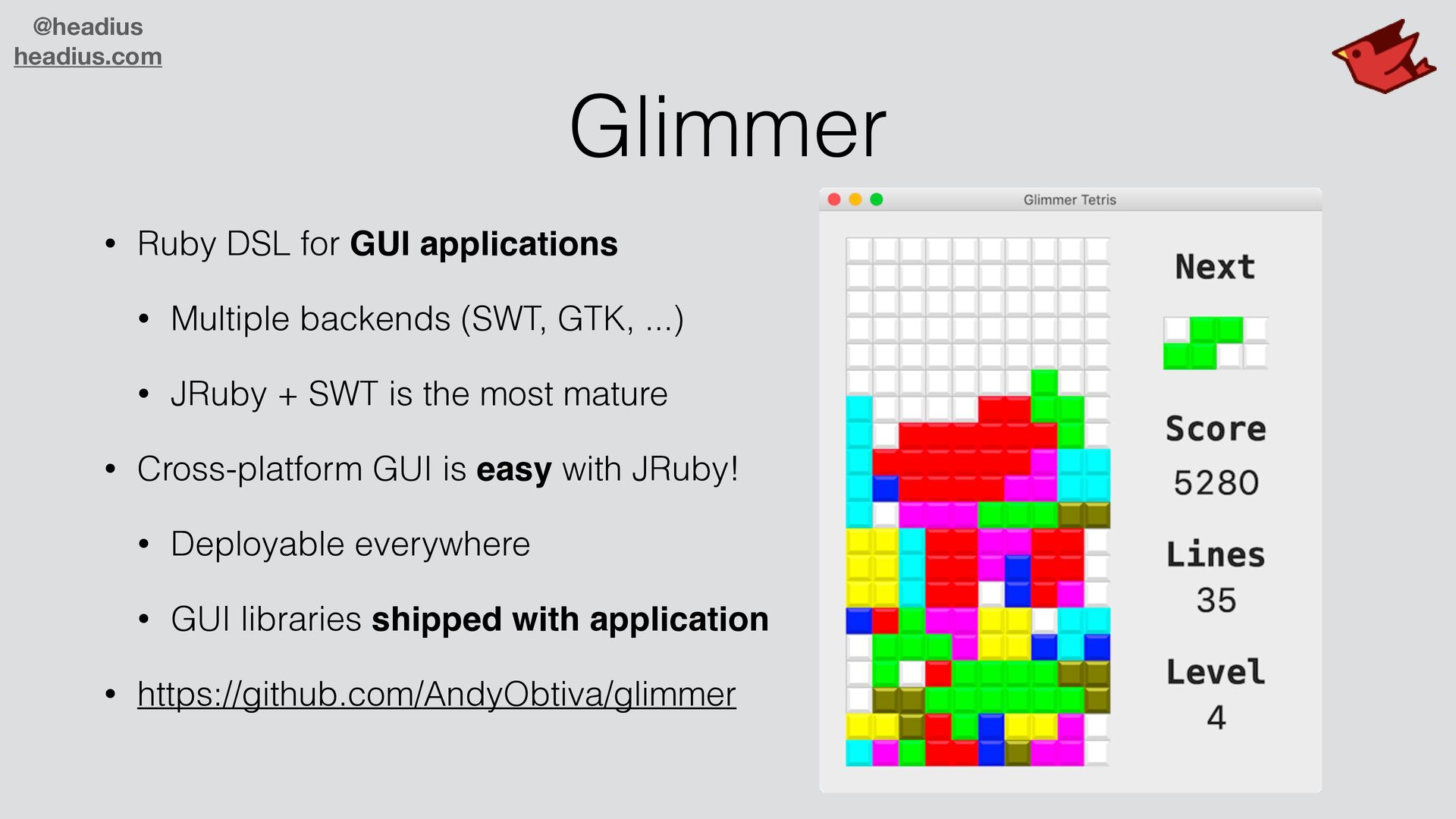 JRuby is more than Ruby for JVM! Optimize your code, max out cores, deploy single-file apps, build portable GUIs and more. It's fun and easy with JRuby!