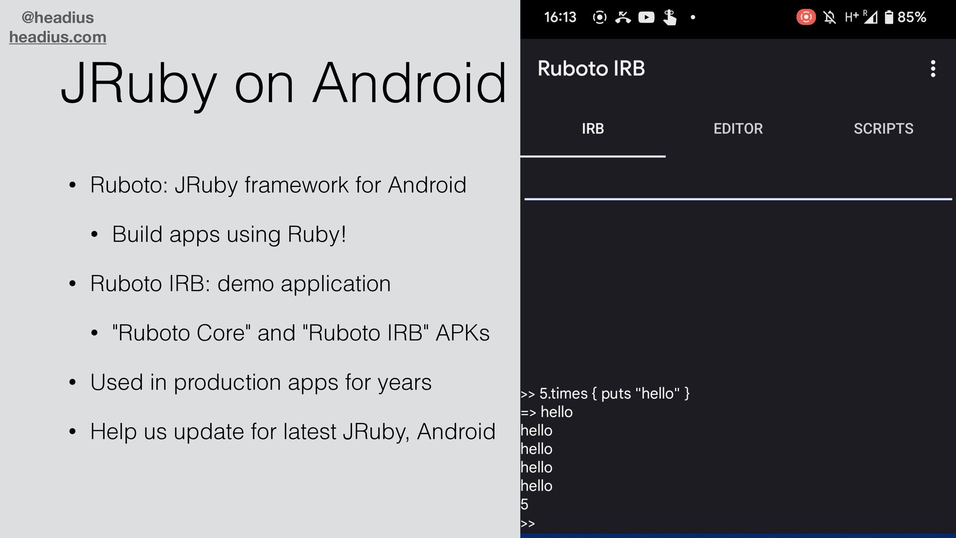 Android • Build apps using Ruby! • Ruboto IRB: demo application • "Ruboto Core" and "Ruboto IRB" APKs • Used in production apps for years • Help us update for latest JRuby, Android