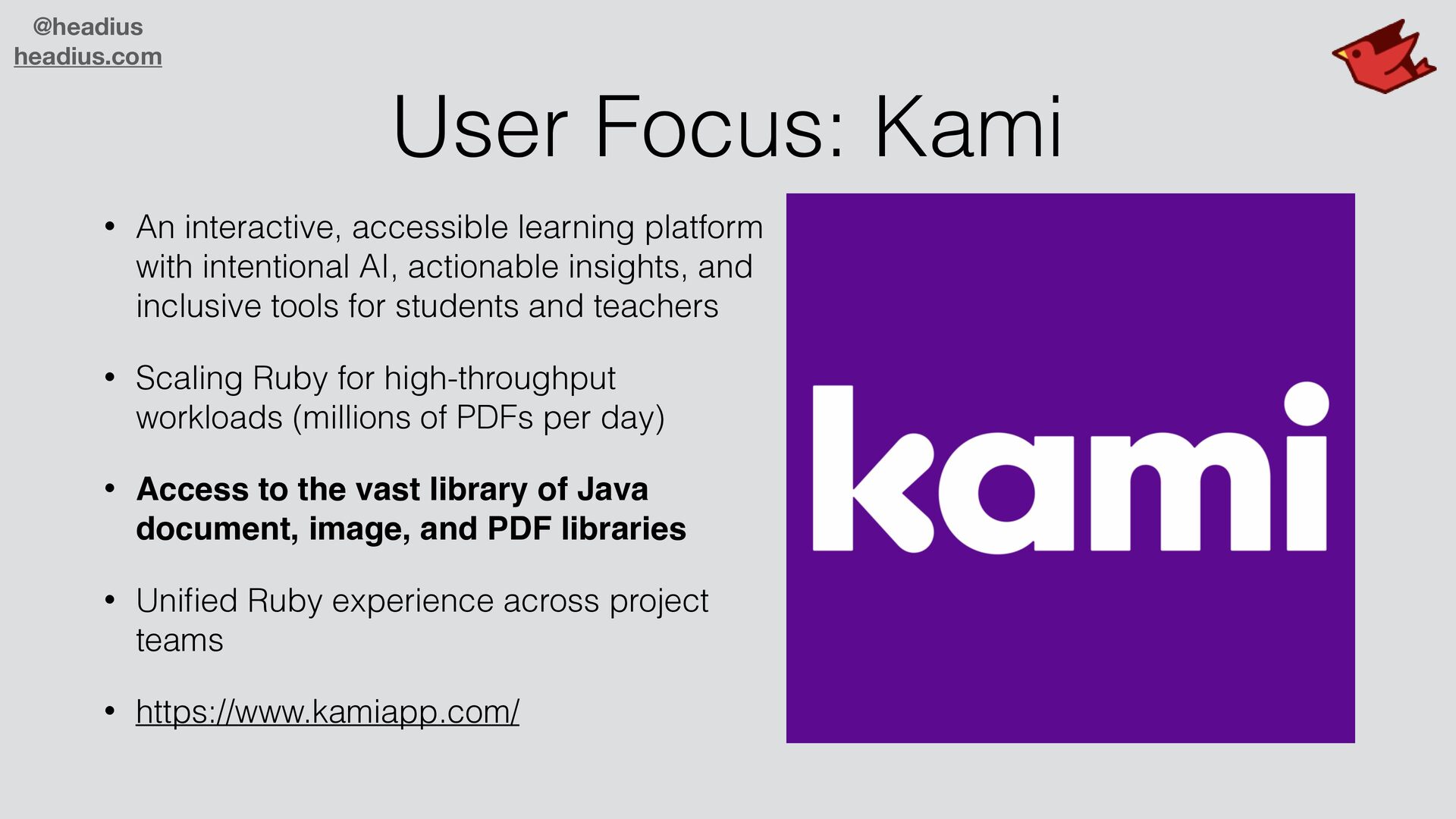 platform with intentional AI, actionable insights, and inclusive tools for students and teachers • Scaling Ruby for high-throughput workloads (millions of PDFs per day) • Access to the vast library of Java document, image, and PDF libraries • Uni fi ed Ruby experience across project teams • https://www.kamiapp.com/