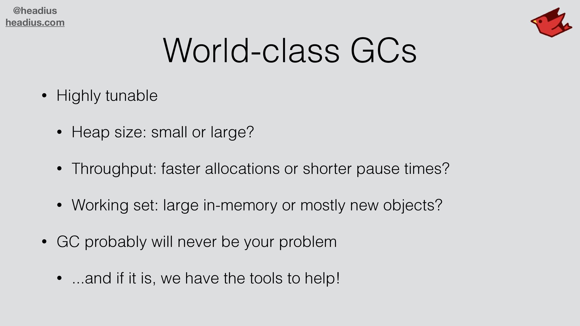 small or large? • Throughput: faster allocations or shorter pause times? • Working set: large in-memory or mostly new objects? • GC probably will never be your problem • ...and if it is, we have the tools to help!