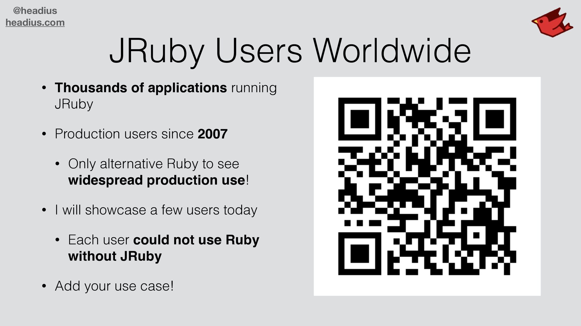 JRuby • Production users since 2007 • Only alternative Ruby to see widespread production use! • I will showcase a few users today • Each user could not use Ruby without JRuby • Add your use case!