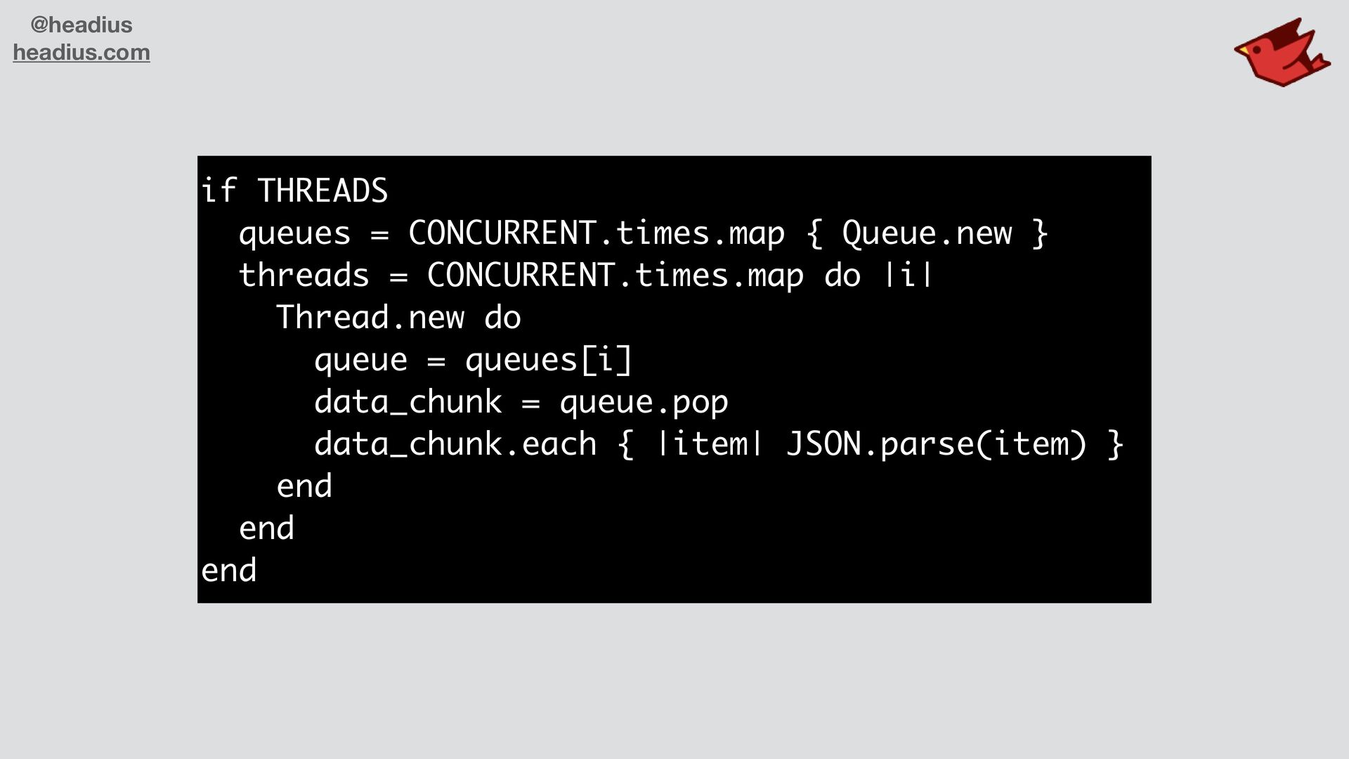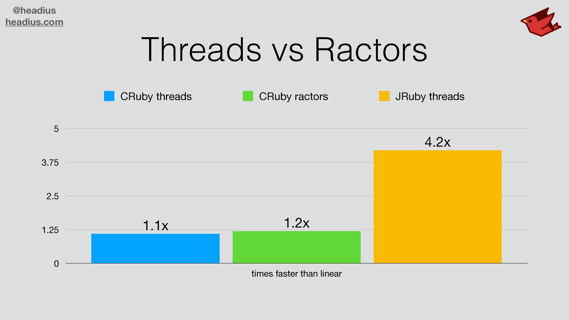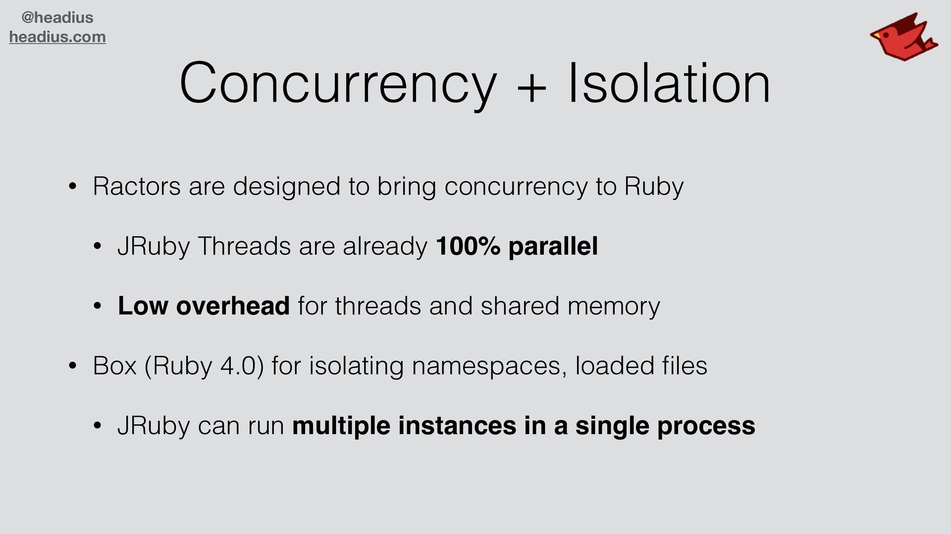 bring concurrency to Ruby • JRuby Threads are already 100% parallel • Low overhead for threads and shared memory • Box (Ruby 4.0) for isolating namespaces, loaded fi les • JRuby can run multiple instances in a single process