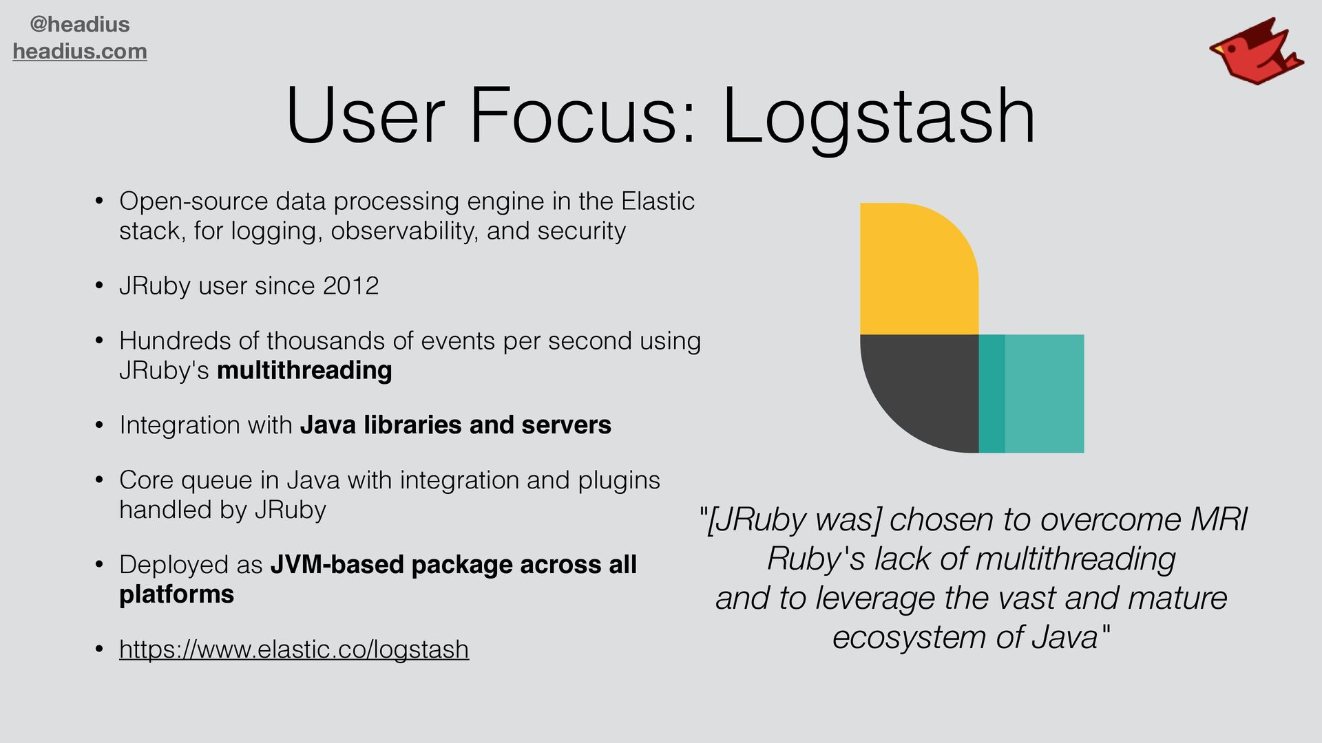 in the Elastic stack, for logging, observability, and security • JRuby user since 2012 • Hundreds of thousands of events per second using JRuby's multithreading • Integration with Java libraries and servers • Core queue in Java with integration and plugins handled by JRuby • Deployed as JVM-based package across all platforms • https://www.elastic.co/logstash "[JRuby was] chosen to overcome MRI Ruby's lack of multithreading and to leverage the vast and mature ecosystem of Java"