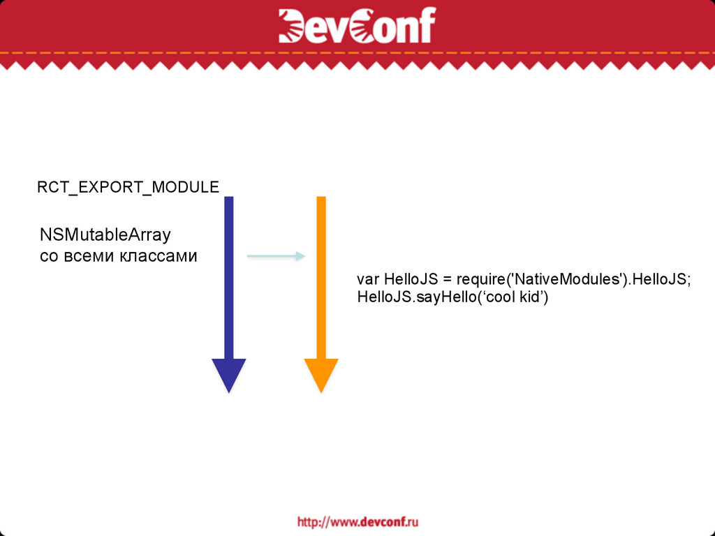 RCT_EXPORT_MODULE NSMutableArray со всеми классами var HelloJS = require('NativeModules').HelloJS; HelloJS.sayHello(‘cool