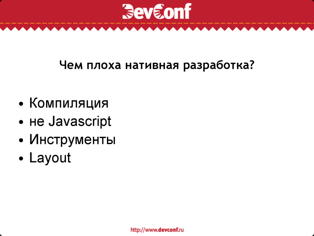 Чем плоха нативная разработка? • Компиляция • не Javascript •