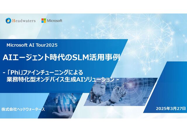 ・クラウド基盤構築支援 ・ハイブリッドアプリ開発 ・業務デザイン支援 ・Power Platform開発支援 事業内容 株式会社ヘッドウォータース 社名 東京都新宿区西新宿6-5-1 新宿アイランドタワー4階 本社 2005年11月 設立 東証グロース上場(4011) 東証コード 1,037名 ※派遣社員・委託先社員を含むデリバリー数 総人員数 株式会社チェンジ(3962) ※資本業務提携 株式会社BTM(5247) ※資本業務提携 ヴィレッジヴァンガードコーポレーション(2769) 株式会社Macbee Planet(7095) 業務提携 ヘッドウォータースコンサルティング(PMO支援) ヘッドウォータースプロフェッショナルズ(常駐支援) DATA IMPACT (海外拠点) グループ会社 Microsoft Japan Partner of the Year 2024 AI Innovation受賞 Advanced Specialization(Data & AI)認定 Microsoft Top Partner Engineer Award 2024 AI 部門最多5名受賞、Azure部門 2名受賞 Azure OpenAI Service RA Advanced パートナー 世界機械学習コンペ「Kaggle」 メダリスト複数在籍
