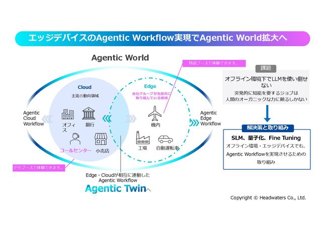 ⼯場 銀⾏ ⼩売店 オフィ ス 当社グループが先駆的に 取り組んでいる領域 主流の動向領域 SLM、量⼦化、Fine Tuning オフライン環境・エッジデバイスでも、 Agentic Workflowを実現させるための 取り組み コールセンター エッジデバイスのAgentic Workflow実現でAgentic World拡⼤へ Edge・Cloudが相互に連動した Agentic Workflow へ Agentic Edge Workflow Agentic Cloud Workflow Agentic World デモブースで体験できます。 オフライン環境下でLLMを使い倒せ ない 突発的に知能を要するジョブは ⼈間のオーガニックな⼒に頼るしかない 課題 解決策と取り組み 特設ブースで体験できます。